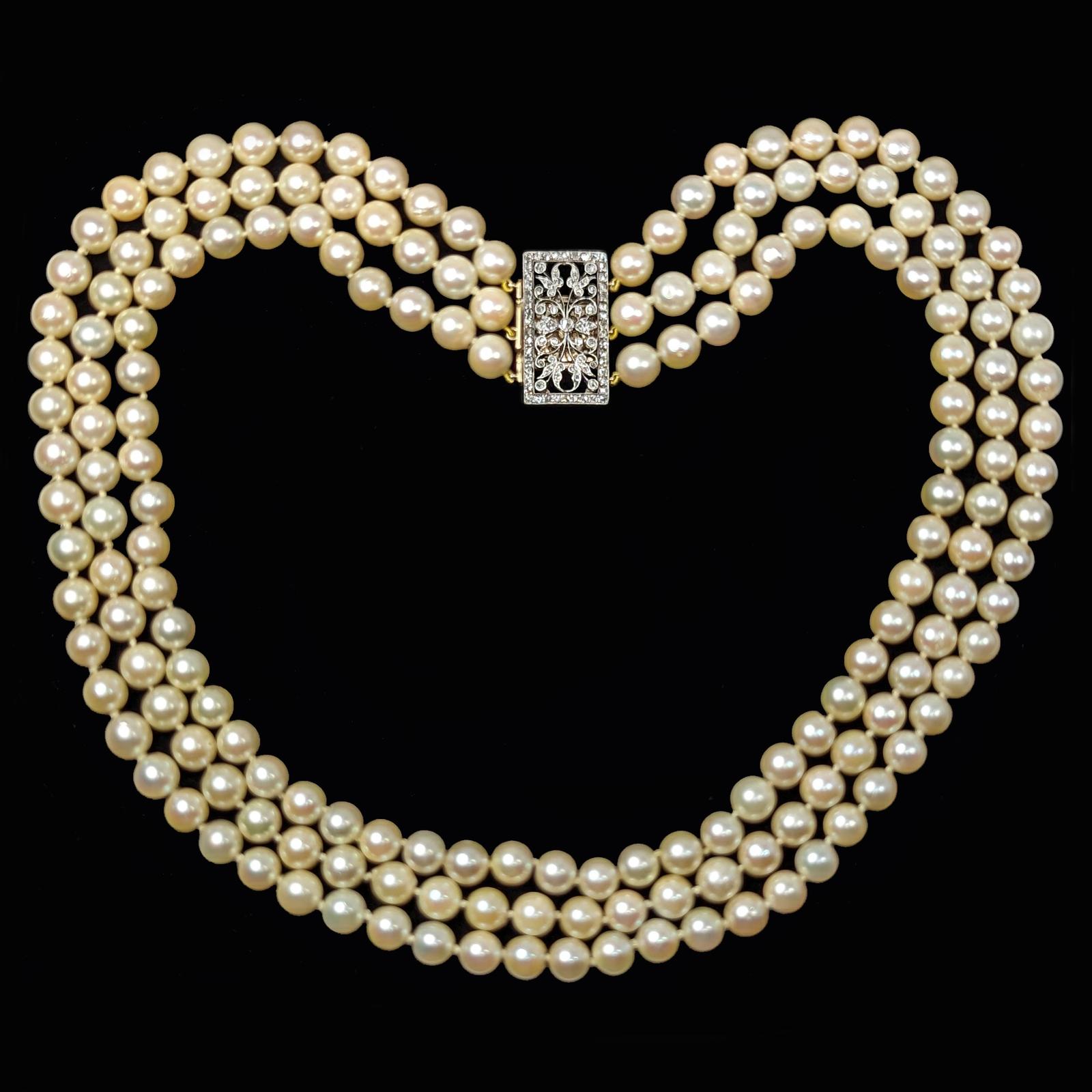 Vintage Pearl Necklace with Rose Cut Diamond Clasp Triple Strand 1950s Necklace (1 of 11)