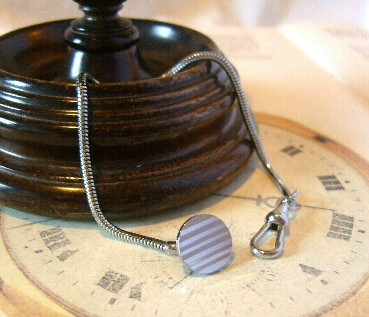 Vintage Pocket Watch Chain 1970s Silver Chrome Snake Link With Ornate Button Hole Fob