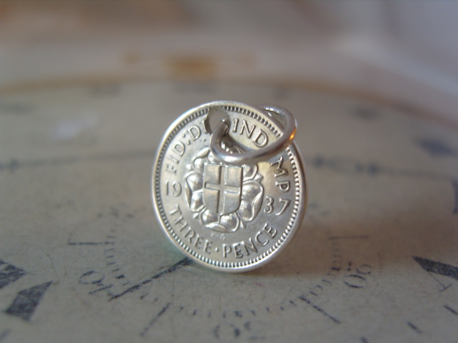 Vintage Pocket Watch Chain Fob 1937 Lucky Silver Threepence 3D Coin Fob