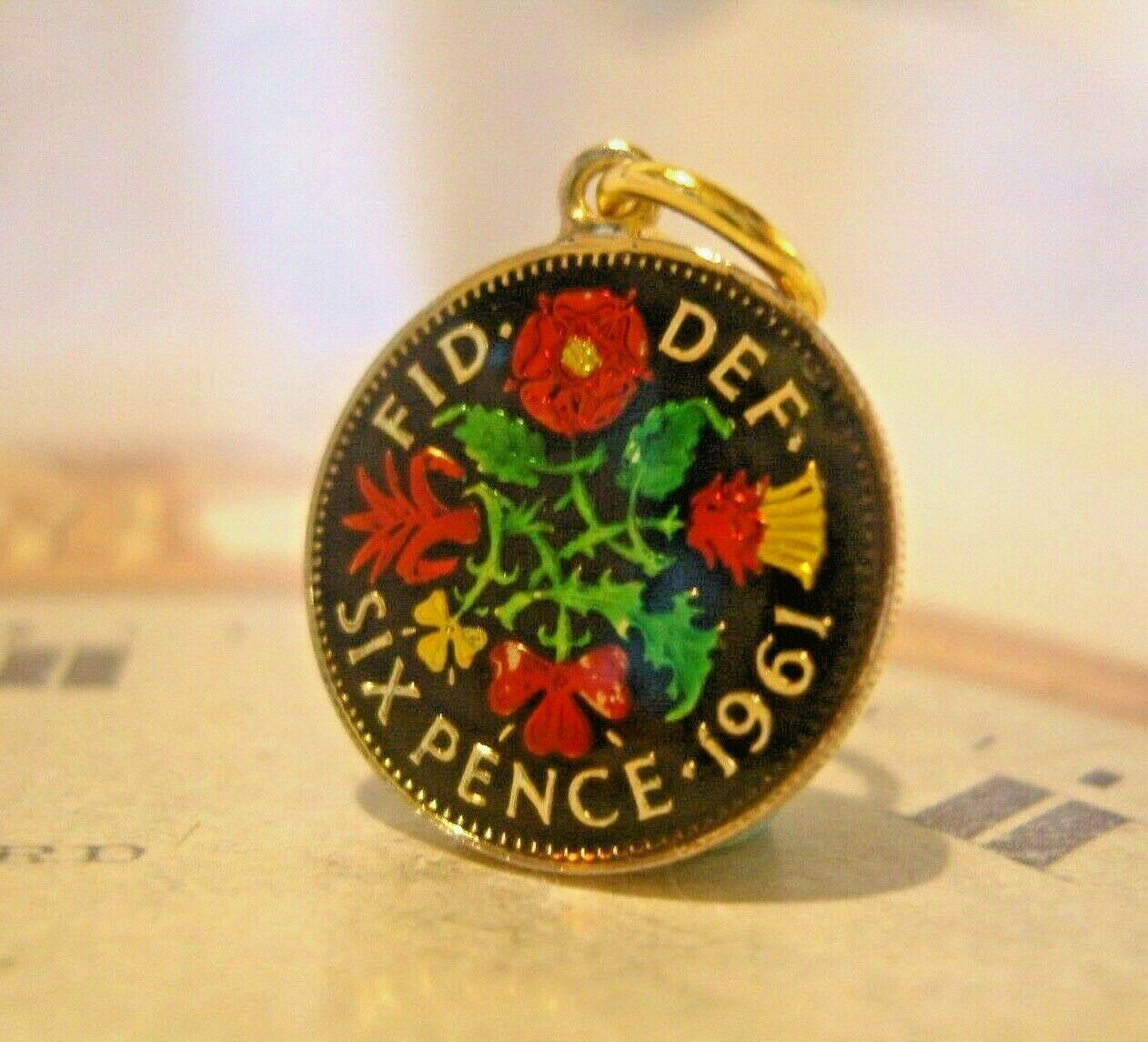 Vintage Pocket Watch Chain Sixpence Fob 1961 12ct Gold Plated & Multi Coloured Enamel Coin Fob