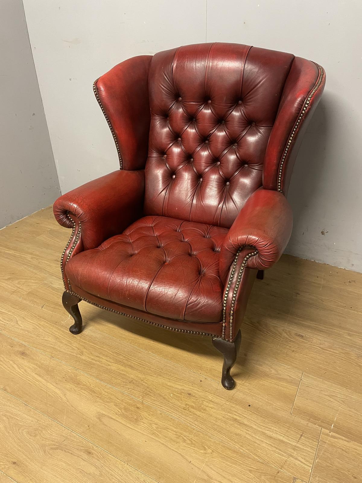 Vintage Red Leather Deep Buttoned Queen Anne Style Winged Armchair