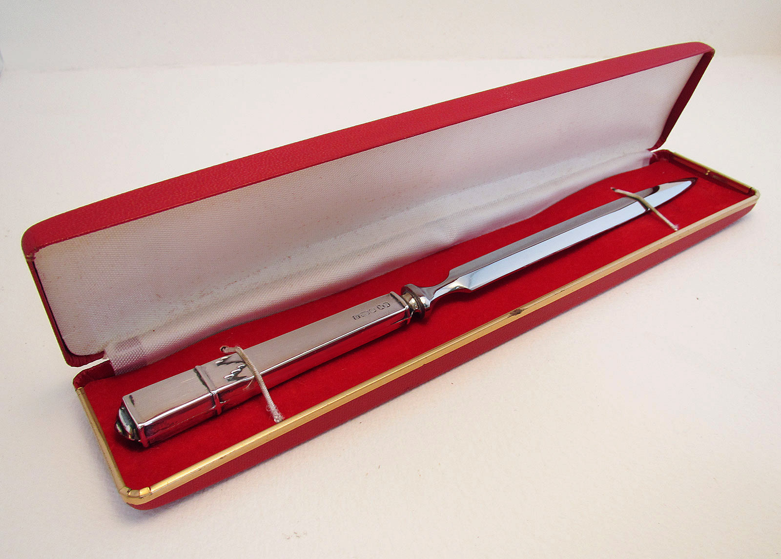 Vintage / Retro Sterling Silver Handled Letter Opener Paper Knife, Art Deco / Modernist Style 1976 Red Case Box