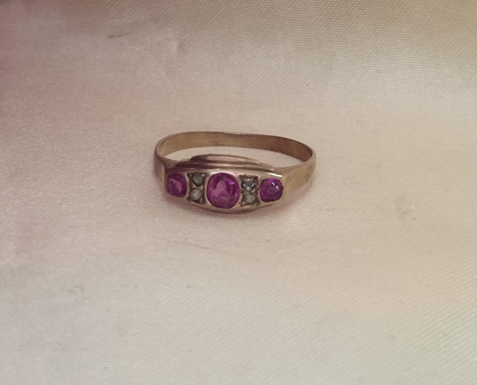 A lovely old rose gold ring set with 3 rubies and 4 small diamonds in between. Good preowned vintage condition, please see all photos for details. We are unable to find a hallmark. Size M ((US 6.25)