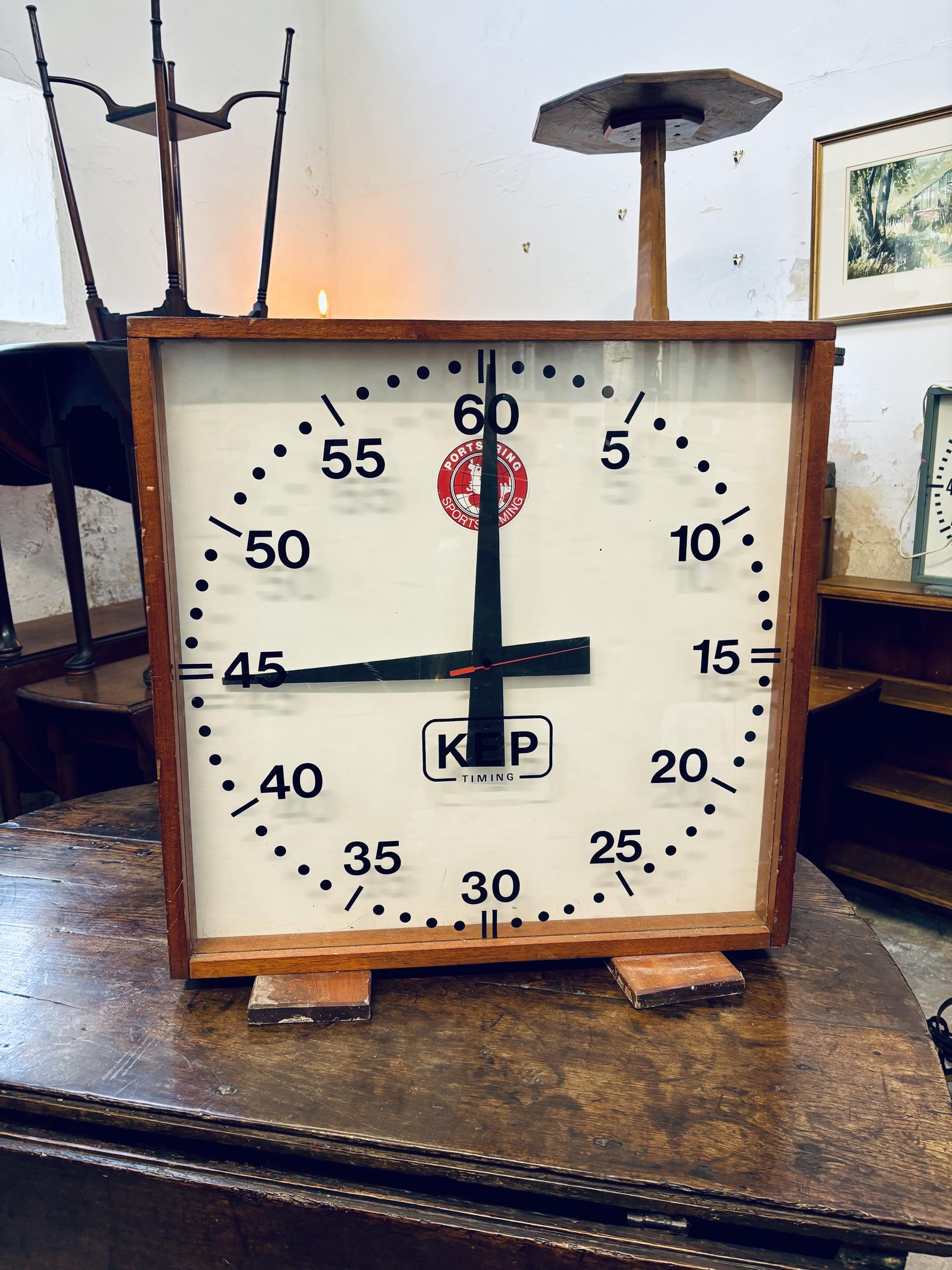 A striking mid-century sports timing clock manufactured by KEP, a company known for producing professional timing equipment for competitive sporting events.