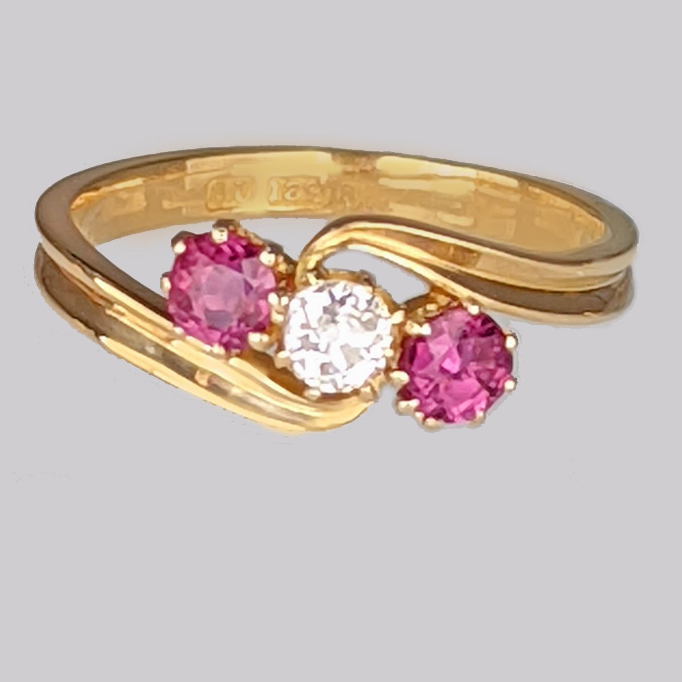 Vintage Ruby & Diamond Trilogy Ring 18ct Gold Old Cut Diamond 1950's Twist Ring