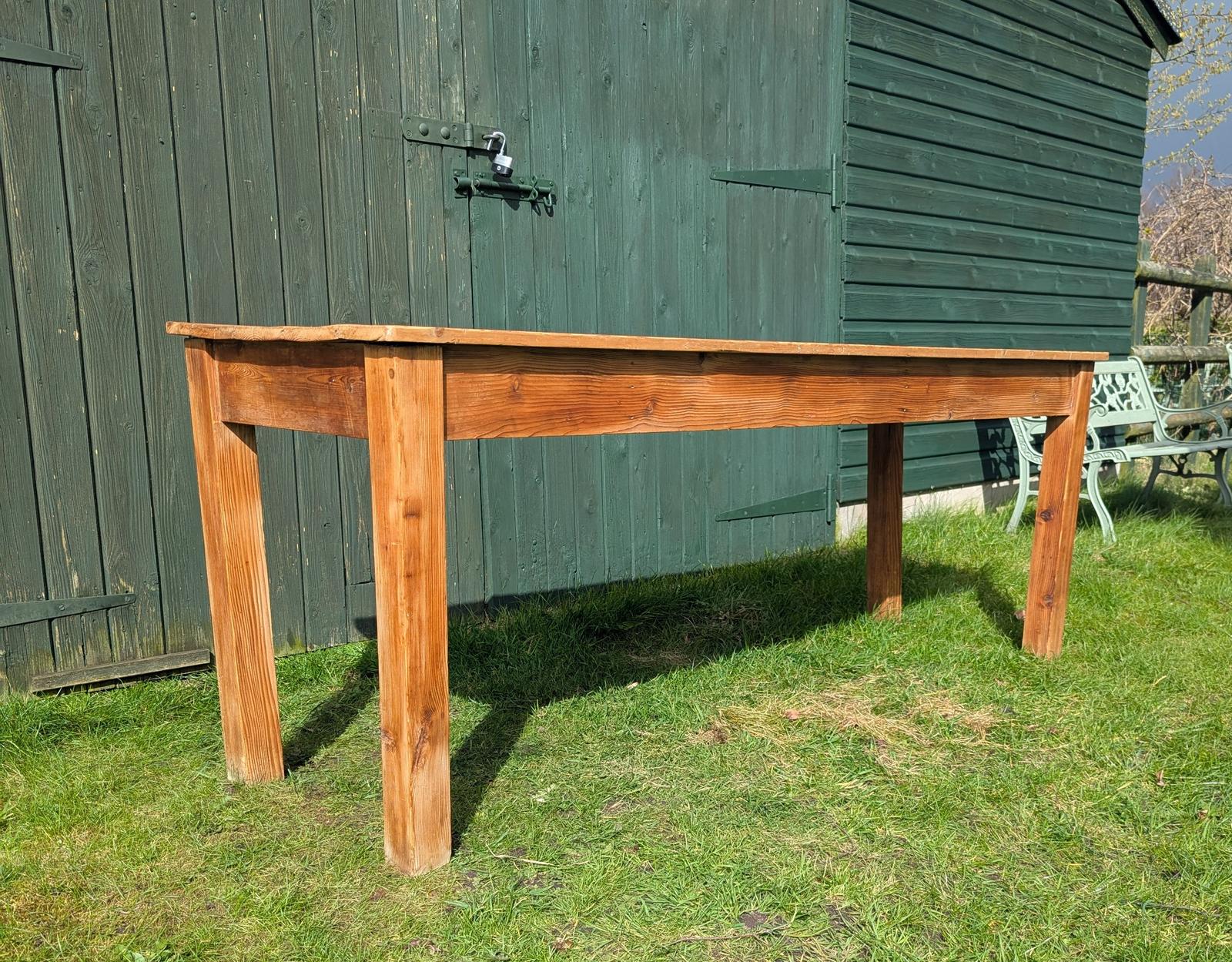 This vintage rustic pine refectory table features a 5 plank top with stout square legs, making it a sturdy and stylish addition to any room.