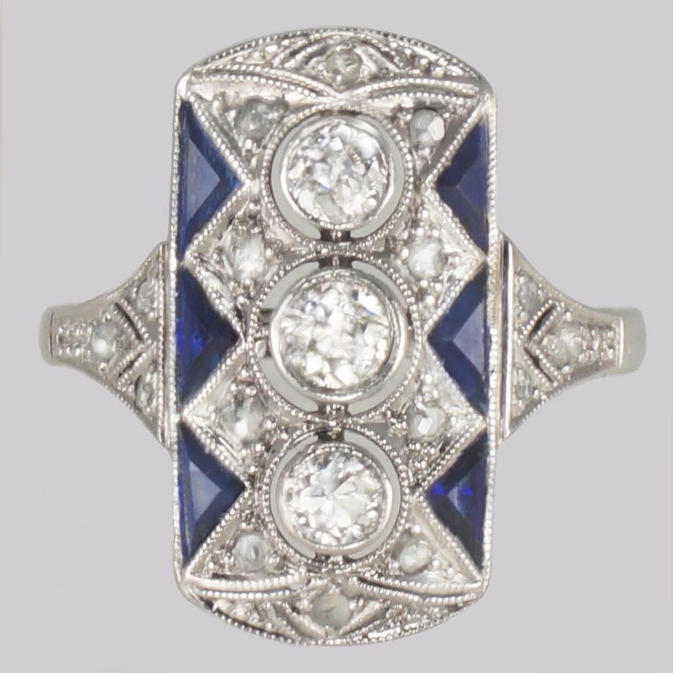 Vintage Sapphire & Old Cut Diamond Ring 18ct Gold Art Deco Style Plaque Ring