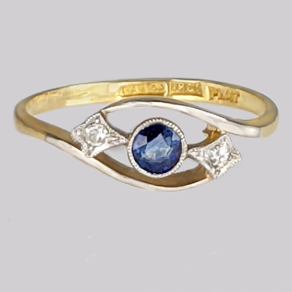 Vintage Sapphire & Old Cut Diamond Trilogy Ring 18ct Gold & Platinum 1930s Ring (1 of 5)