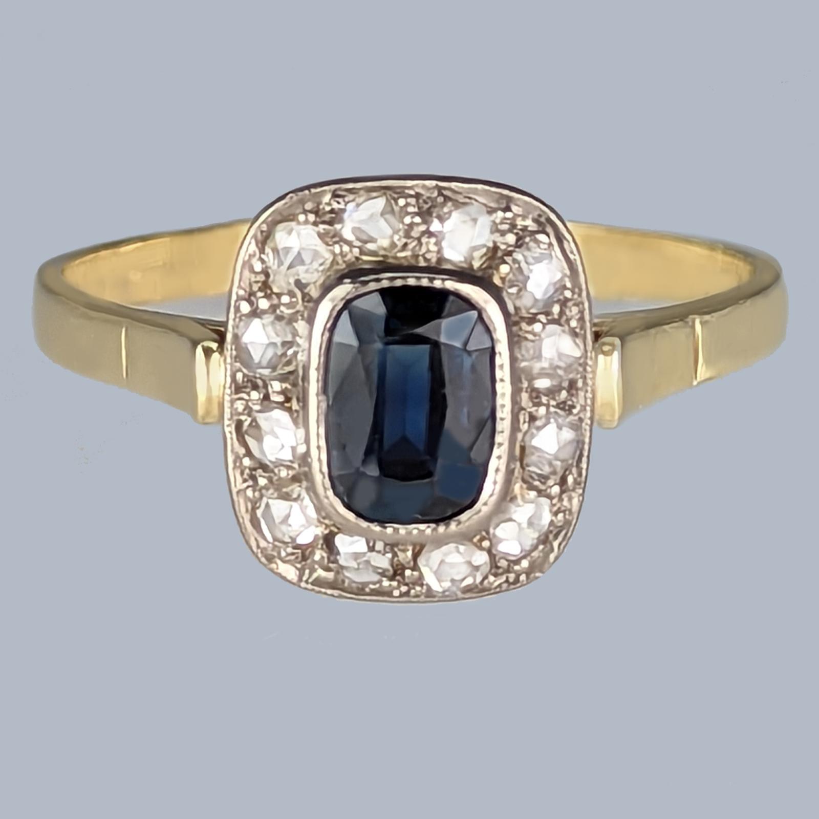 Vintage Sapphire Rose Cut Diamond Cluster Ring 14ct Gold 1950s Victorian Style Ring