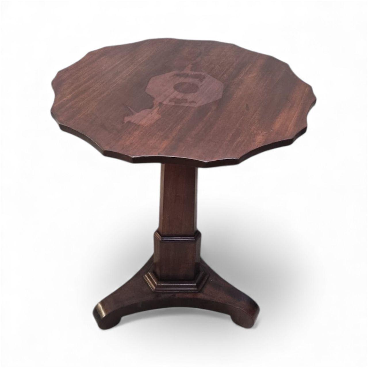 A charming vintage occasional table featuring a scalloped top with attractive natural grain and a solid pedestal base.
