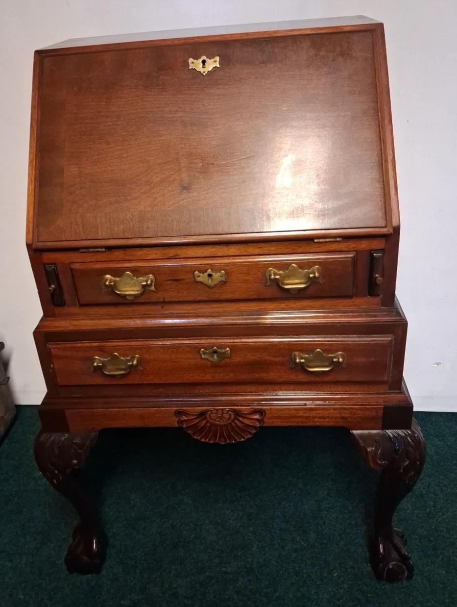 This vintage Secretary slant front desk writing table from the 20th century exudes a classic charm, perfect for adding a touch of history to any room. Made in the United Kingdom, this piece features a brown colour and a striking slant front design, ideal for writing or working at a desk. With its antique pedigree and intricate details, this desk is sure to be a standout addition to any collection of antique furniture. in queen ann style features ball and claw feet there's a indent on front which has been re polished in as picture shows we have no key to lock the locks