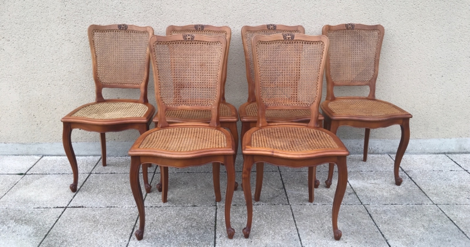 Vintage Set of 6 Bergère Cane Dining Chairs Louis XV Style
