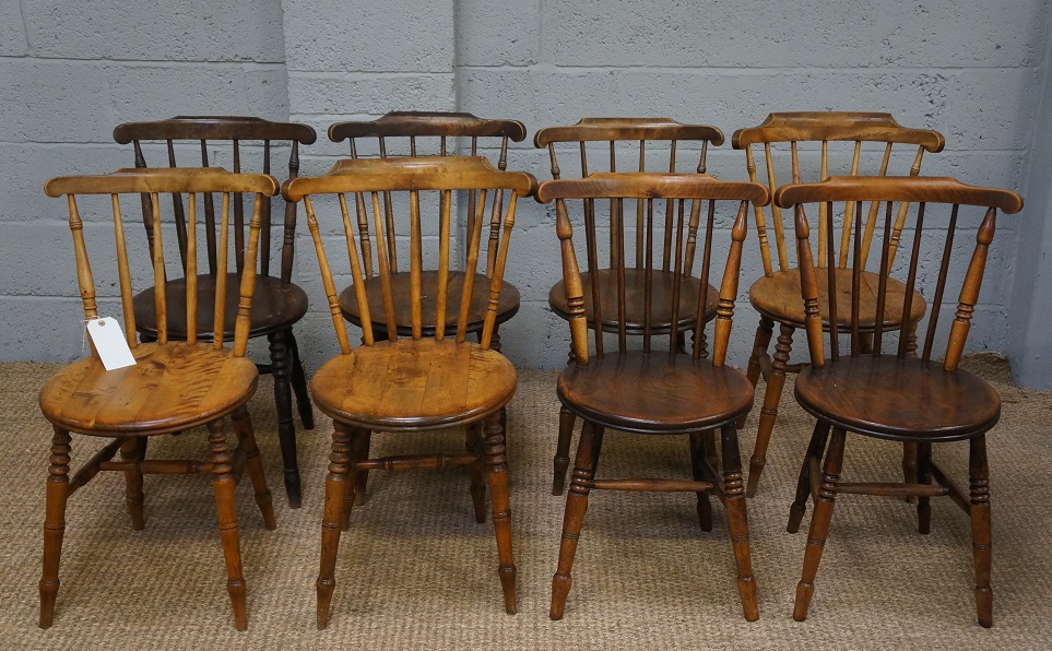 Vintage Set of 8 Pine Spindle Back Kitchen Chairs