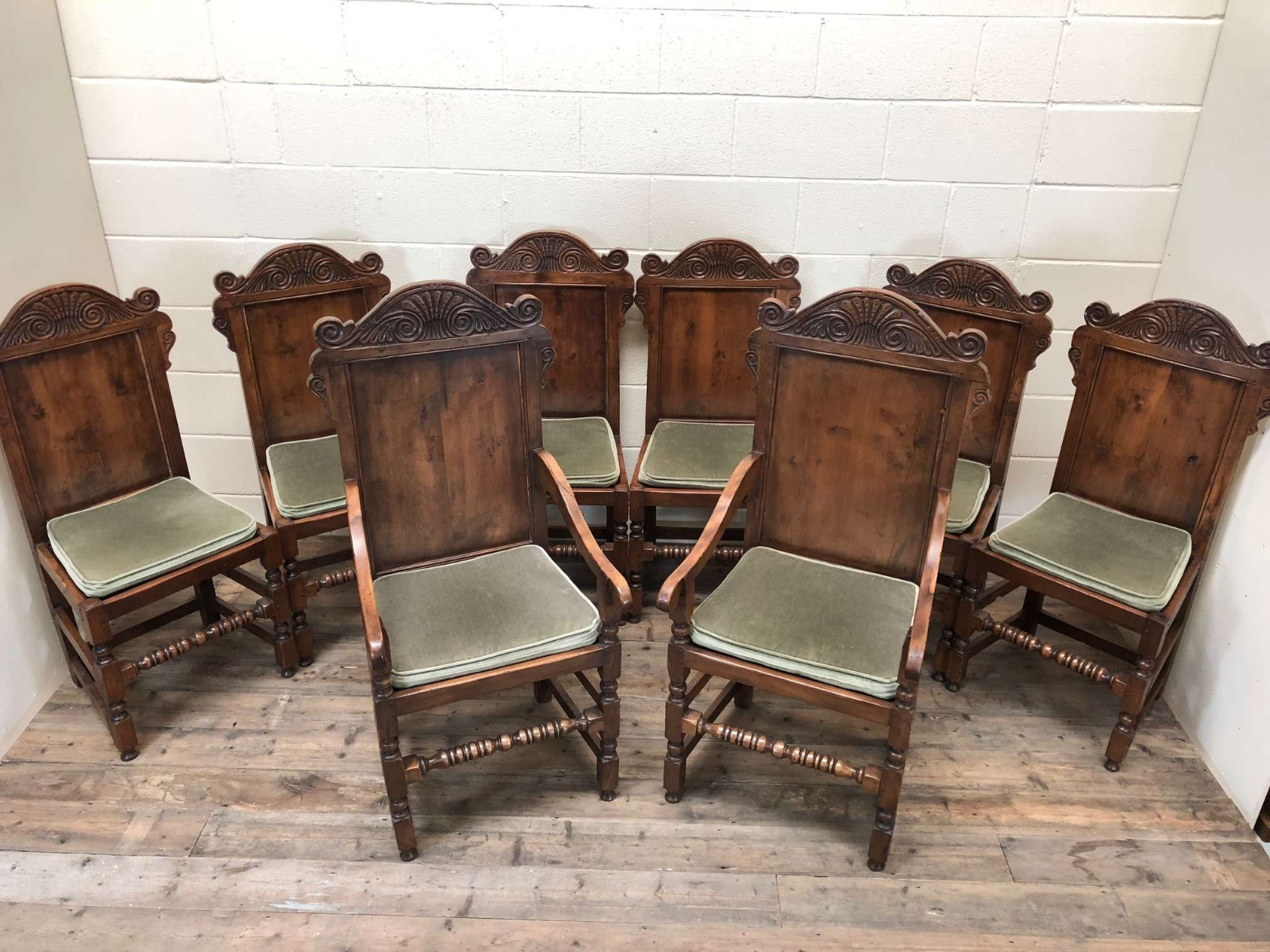 Vintage Set of Eight Carved Yew Dining Chairs with Green Cushion Seats in Gothic Medieval Style (1 of 8)