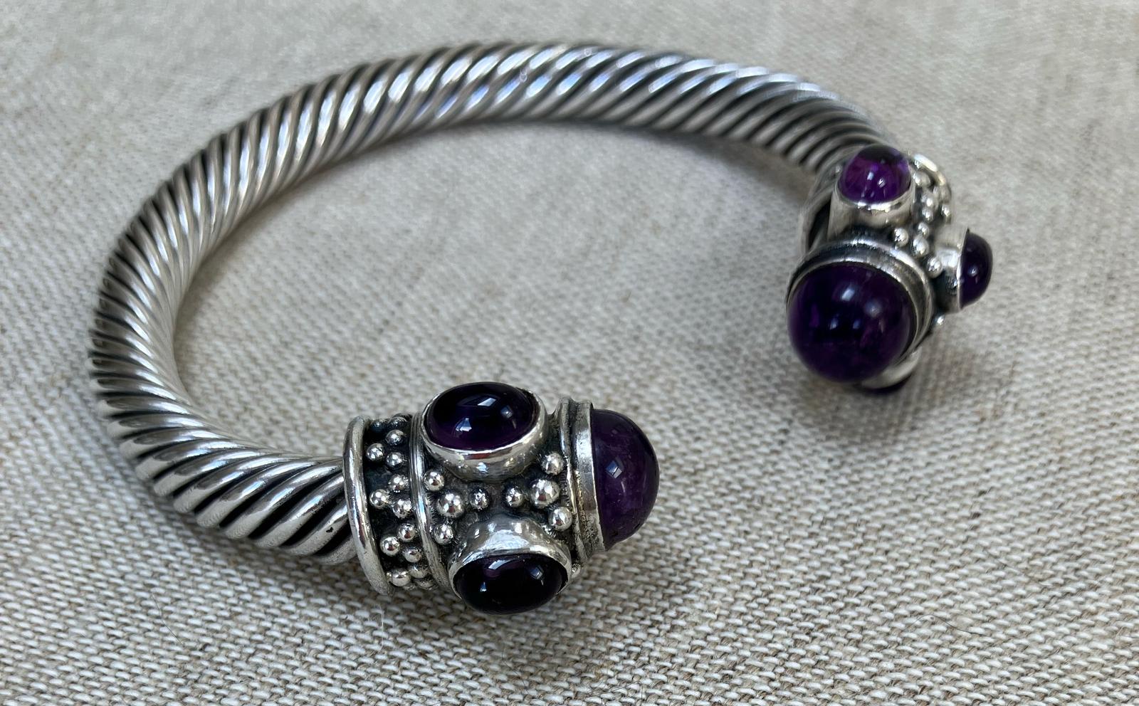 Vintage Silver & Amethyst Torque Cuff Rope Twist Bangle Bracelet