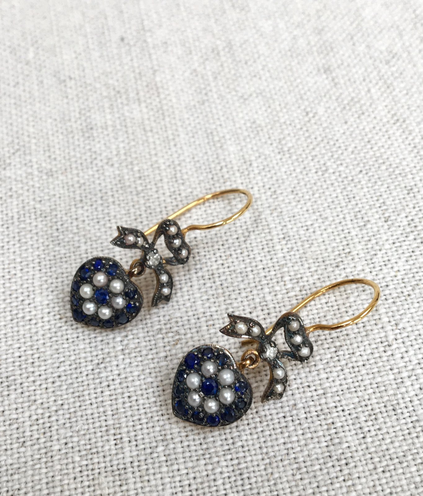 Vintage Silver Gilt Sapphire, Diamond & Pearl Heart Drop Earrings