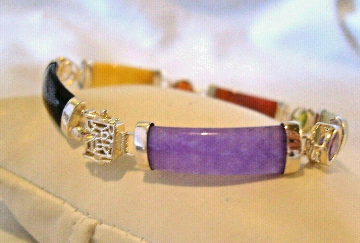 Vintage Silver & Jade Bracelet 1970s Multi Colour Jade & Gem Panels 7 3/4" Length