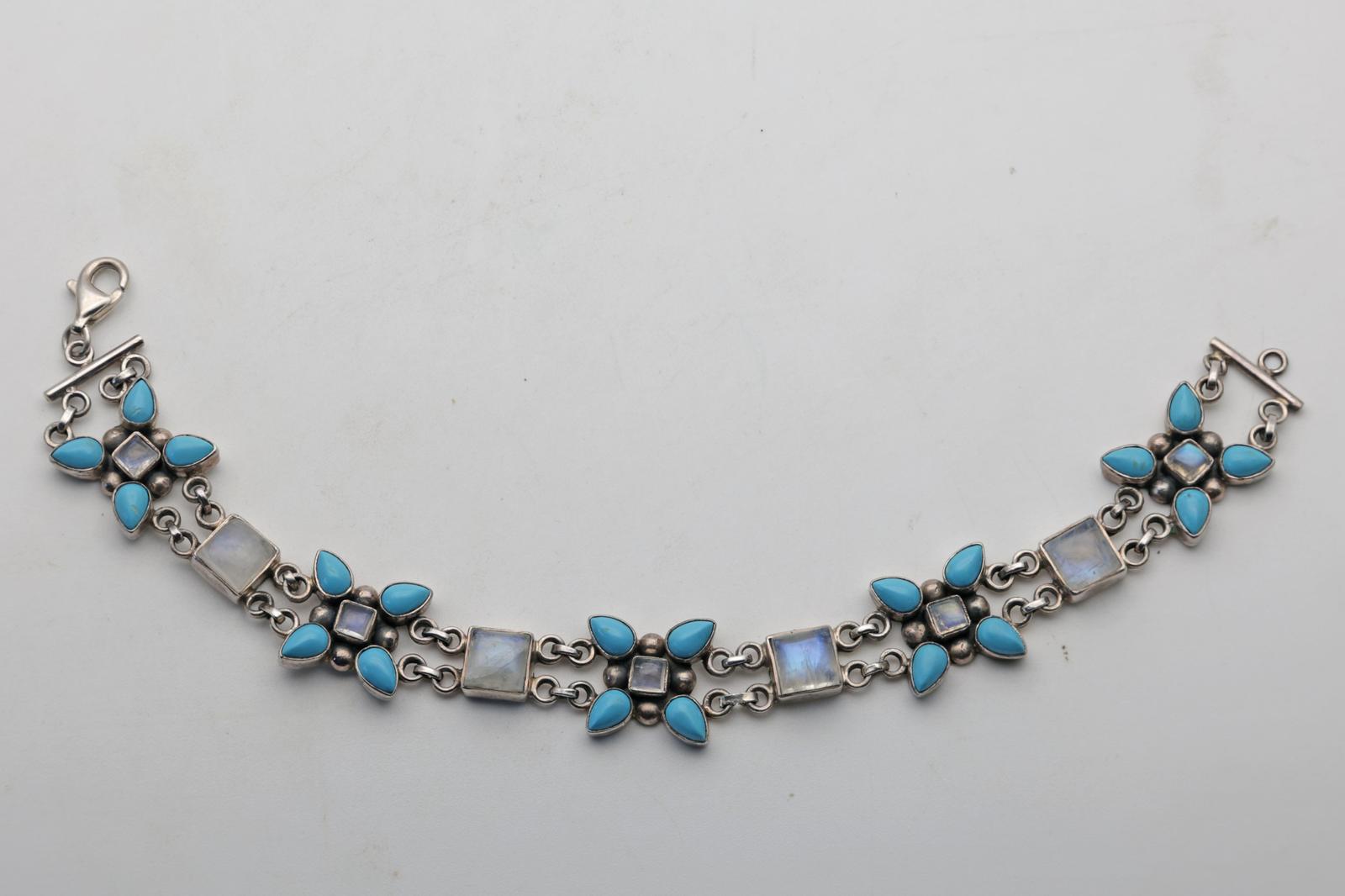 Sterling silver bracelet set with moonstones and turquoise. Four pear shaped turquoise with a square moonstone form a floral design. There are 5 of these separated by square moonstones. Stamped 925 on the clasp. Light surface scratches to the metal, stones are secure with minimal surface wear, clasp is in working order. Measures approx. 18cm. Weight 19gm.