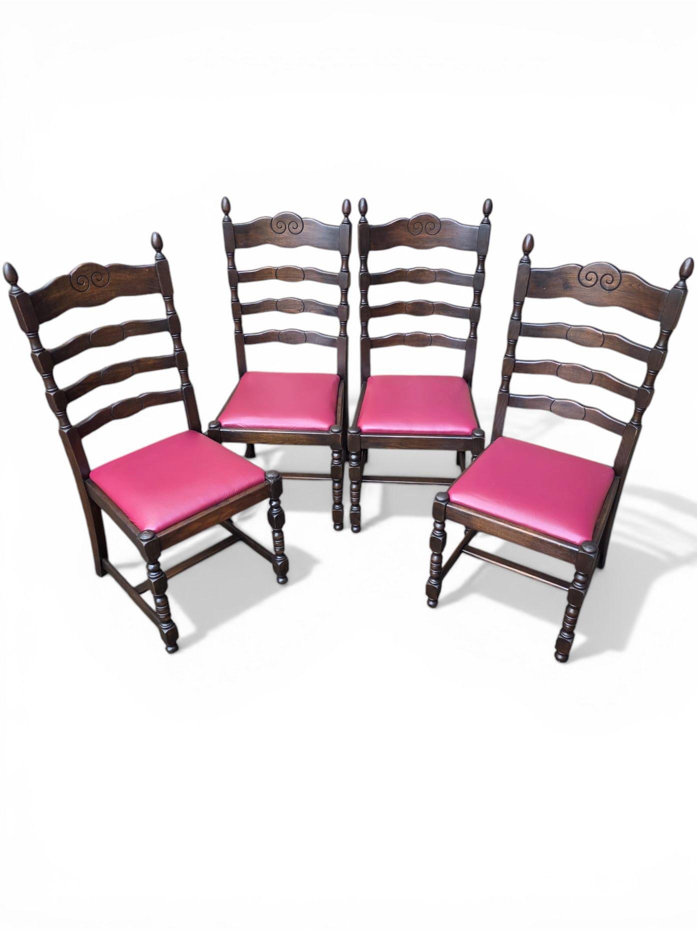 A charming set of four vintage dining chairs, crafted from solid wood and featuring classic ladder back design with turned uprights and decorative top rails. The elegant proportions and traditional craftsmanship give these chairs a timeless presence.