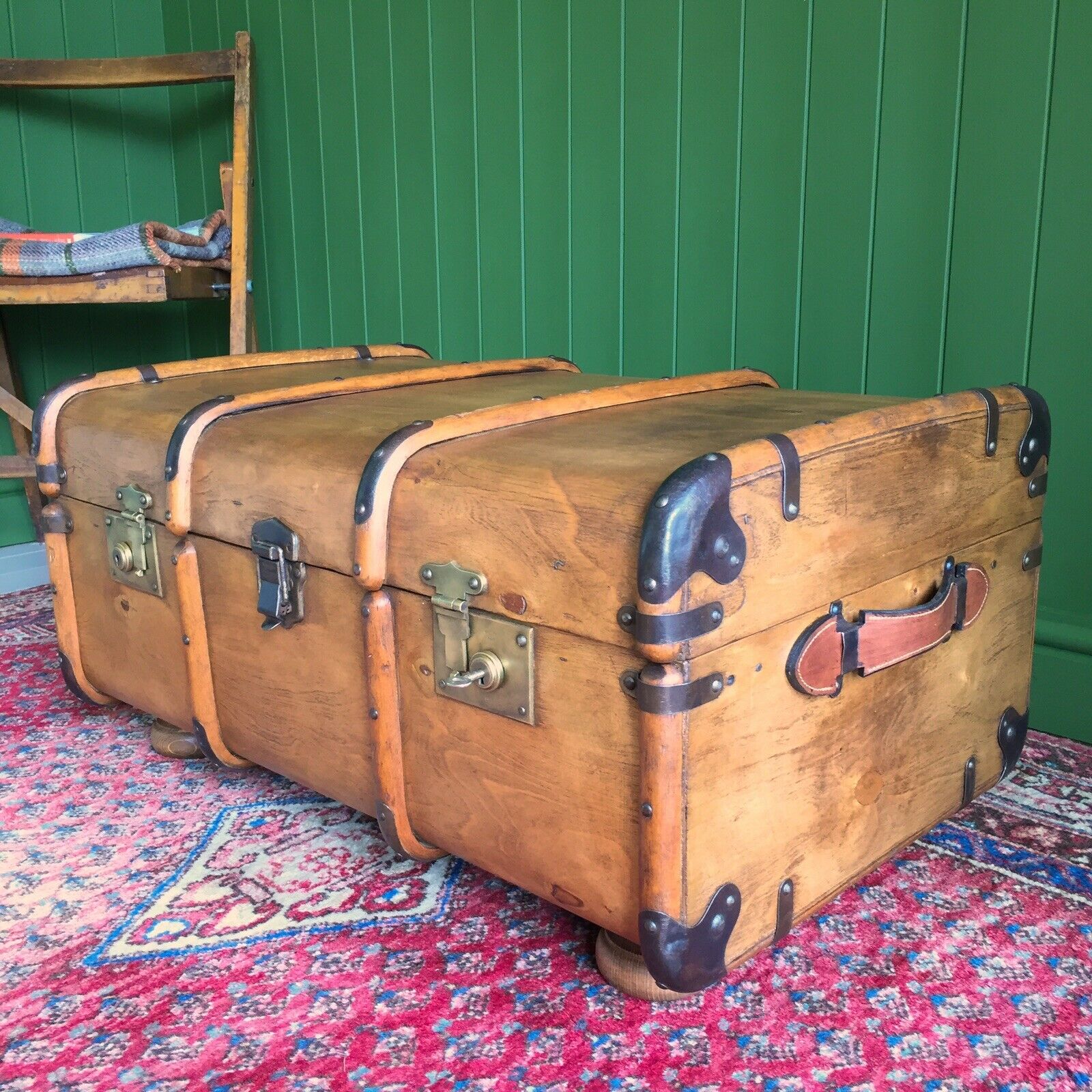 Vintage Steamer Trunk Coffee Table Old Bentwood Travel Trunk + Bun Feet + Key