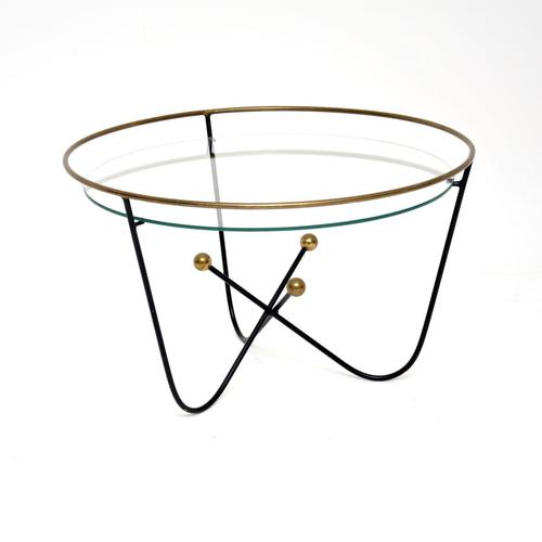 A stylish and iconic vintage steel and brass coffee table by Edward Ihnatowicz. This was made by Mars furniture and was retailed by Heal’s in the 1950s. It has an amazing atomic inspired design, it is of superb quality and is a very useful size. The frame is ebonised steel, with three brass spheres mounted on the base and a brass upper rim. The condition is excellent for its age, with only some minor surface wear here and there. The inset clear circular toughened glass top has been newly made for this, it is immaculate. Width – 66cm, 26 inches Depth – 66cm, 26 inches Height – 41cm, 16 inches