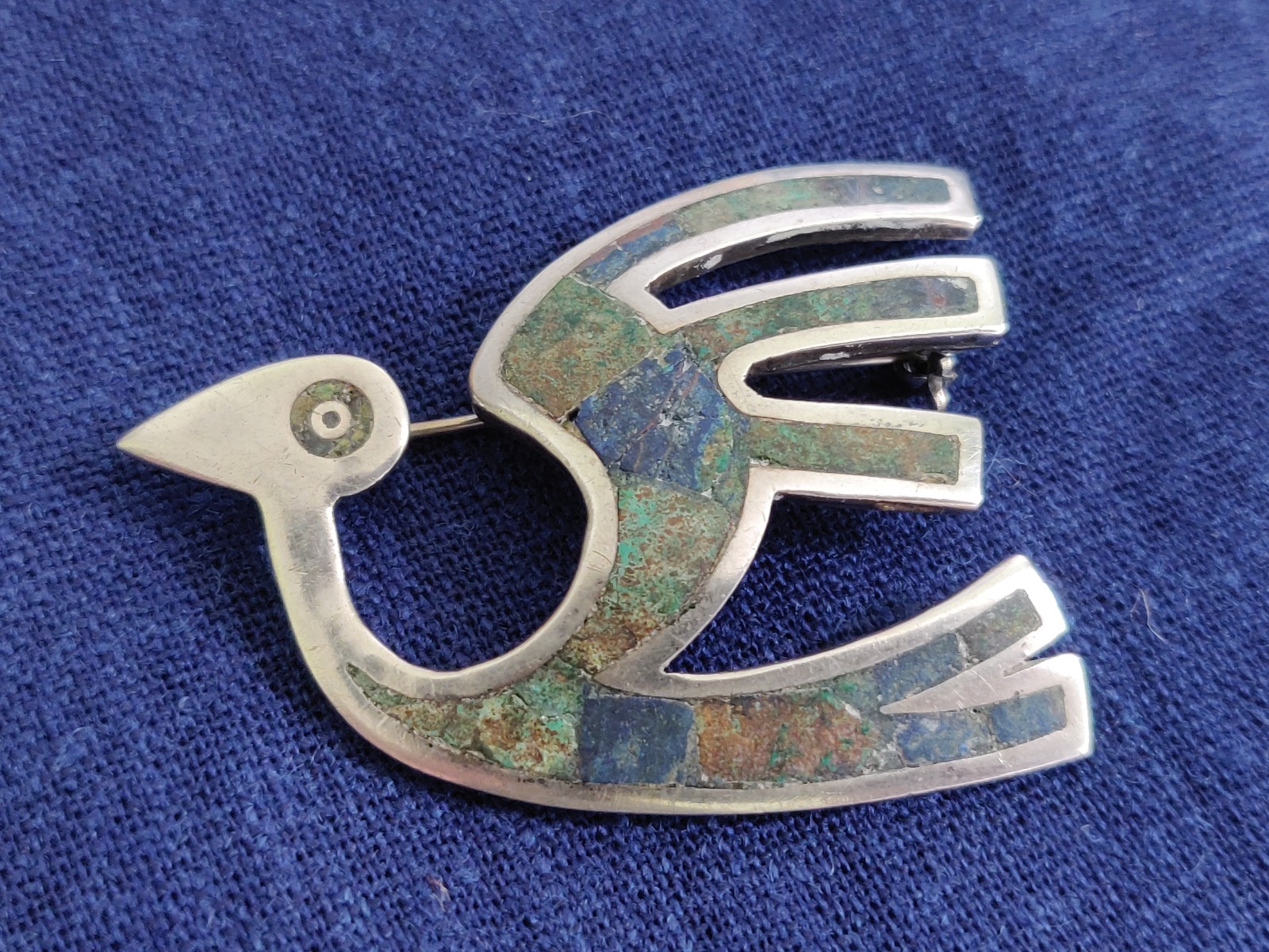 Vintage Sterling Silver Mexico Taxco Crushed Stones Inlay Brooch Pin c.1950