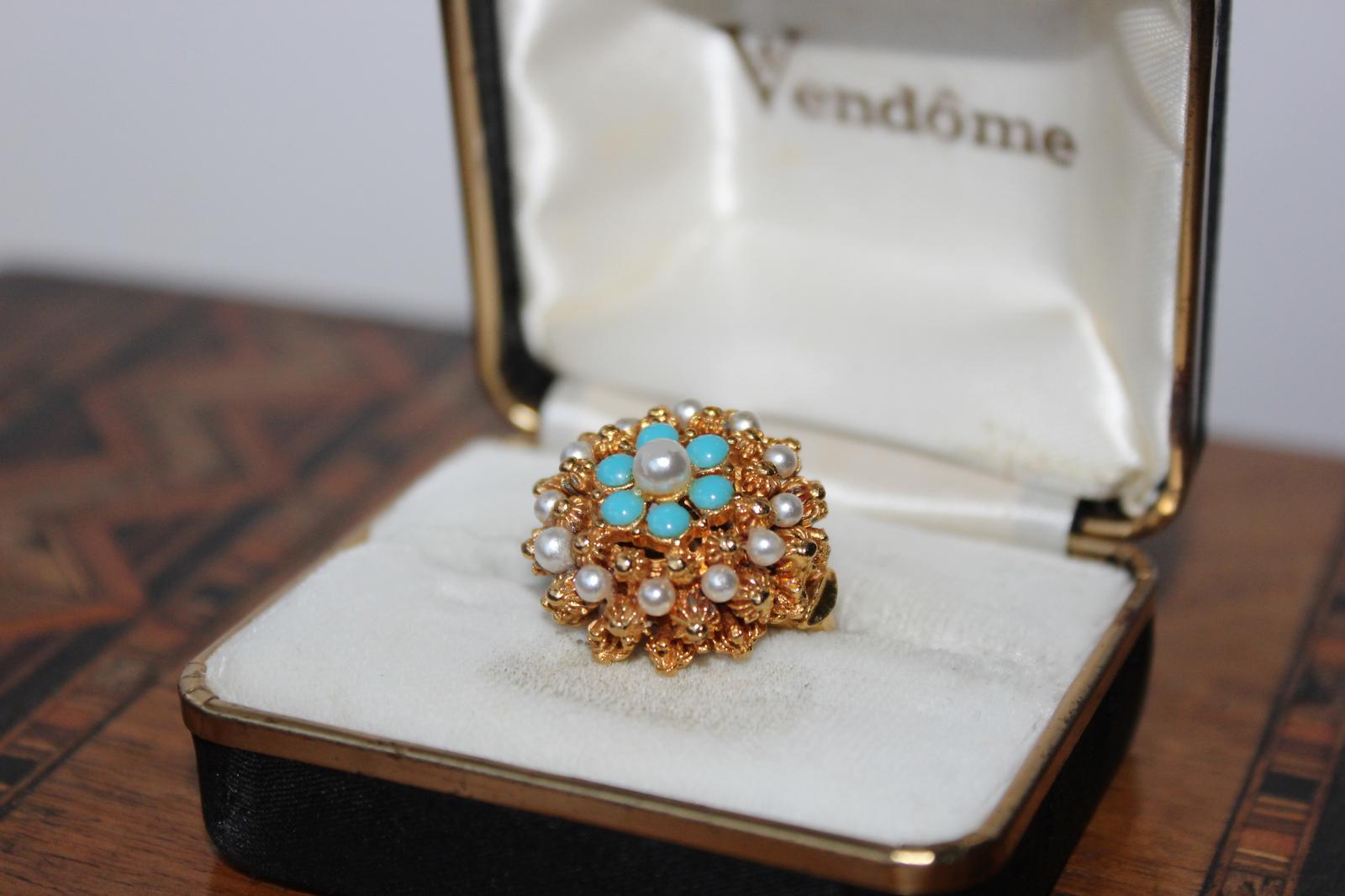 Vintage Stunning Vendome Faux Turquoise & Seed Pearl Designer Dress Ring