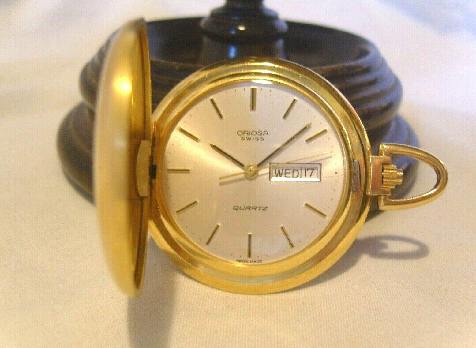 Vintage Swiss Oriosa Pocket Watch 1970s 12ct Gold Plated Full Hunter Quartz Fwo