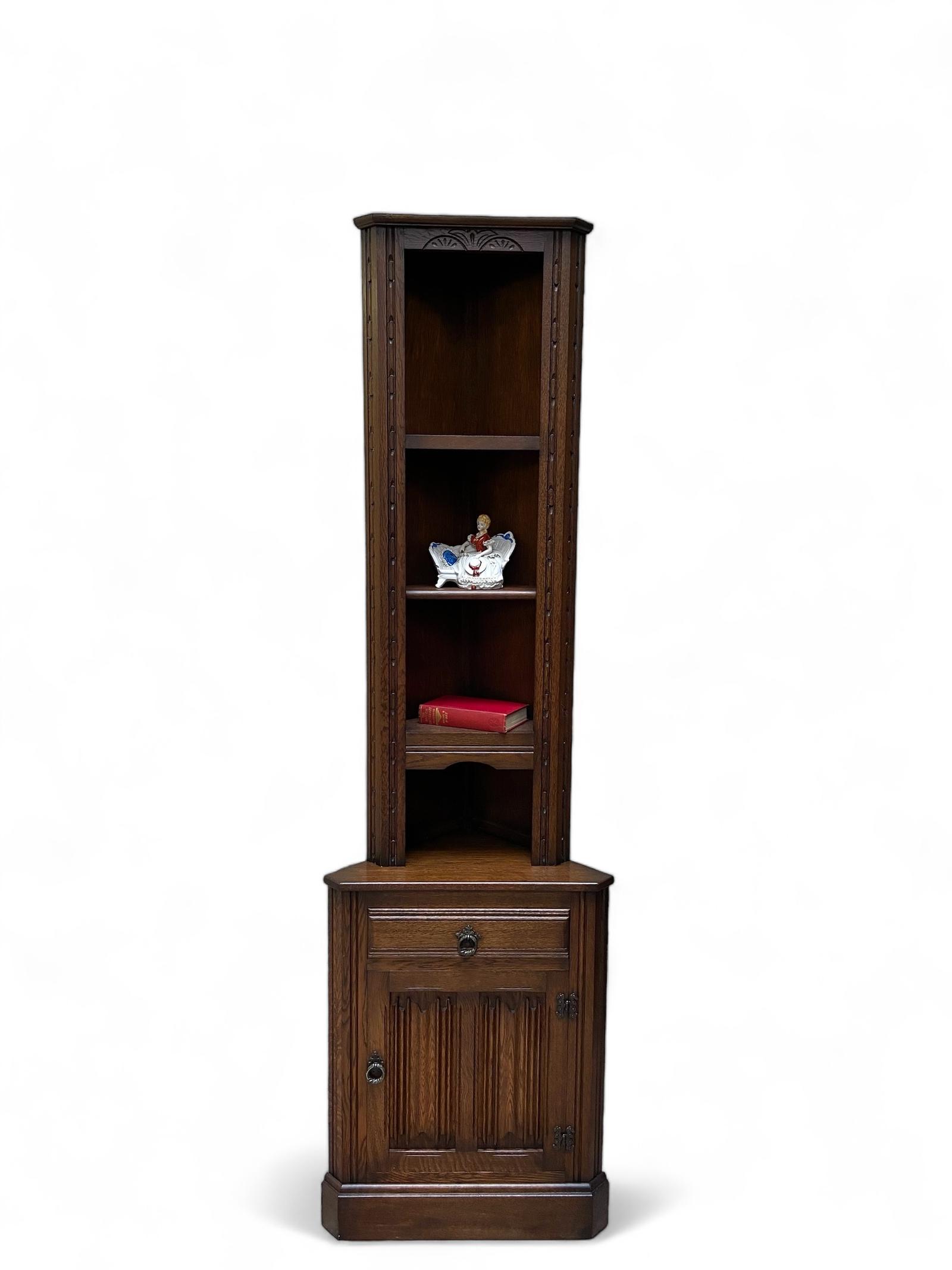 Vintage Tall Corner Cabinet / Shelves & Cupboard / Brown Oak c.1970