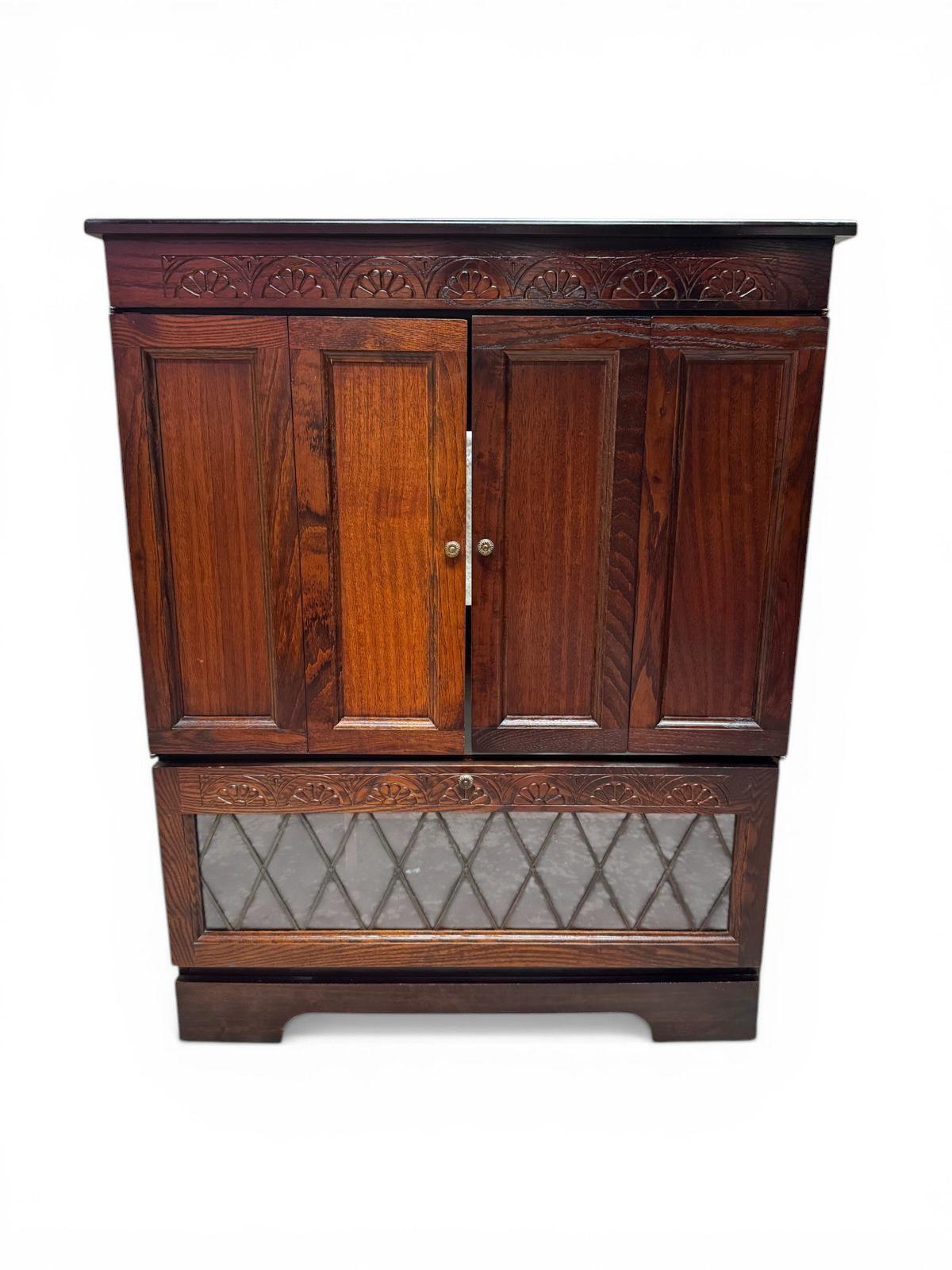 The piece features a rich, warm oak tone with carved decorative frieze and a striking drop-down lower panel with leaded glass detail.