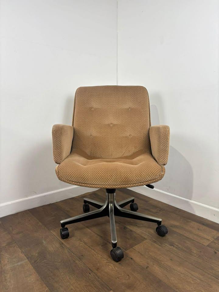 A stylish vintage upholstered office chair with a classic retro design. Featuring a comfortable padded seat and backrest with a subtle two-tone beige and brown patterned fabric, finished with a simple button-back detail.