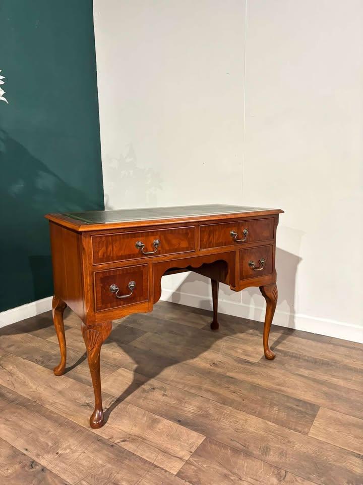 Vintage Walnut Desk Having a Leather Top, and Brass Swan Neck Handles to the Drawers