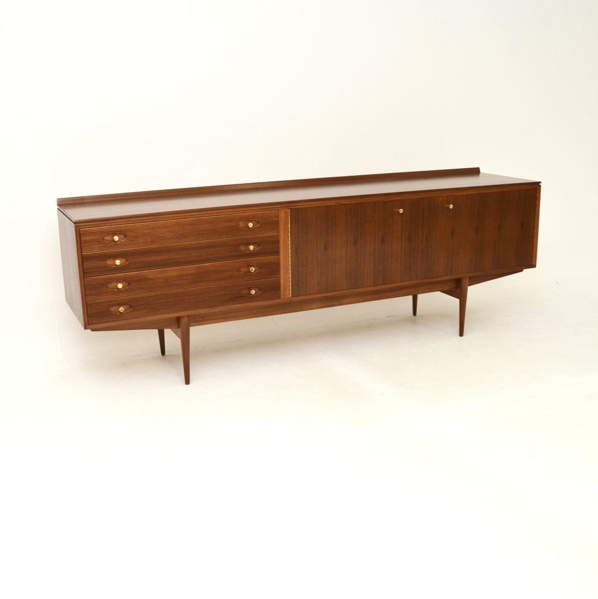 A superb vintage walnut Hamilton sideboard by Robert Heritage for Archie Shine. This was made in England, it dates from the 1960s. The quality is outstanding, this won various design awards when it was released in the 1950’s. This is a particularly rare version, completely made from walnut. The drawers and doors have lovely brass handles, the drawers all have dividers and the top drawer is felt lined; the felt has some light wear. We have had this stripped and re-polished to a very high standard, the condition is immaculate. Width – 229cm, 90 inches Depth – 51cm, 20 inches Height – 79cm, 32 inches