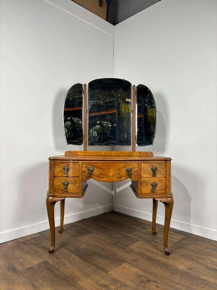 Vintage Walnut Veneered Dressing Table with Triptych Mirror