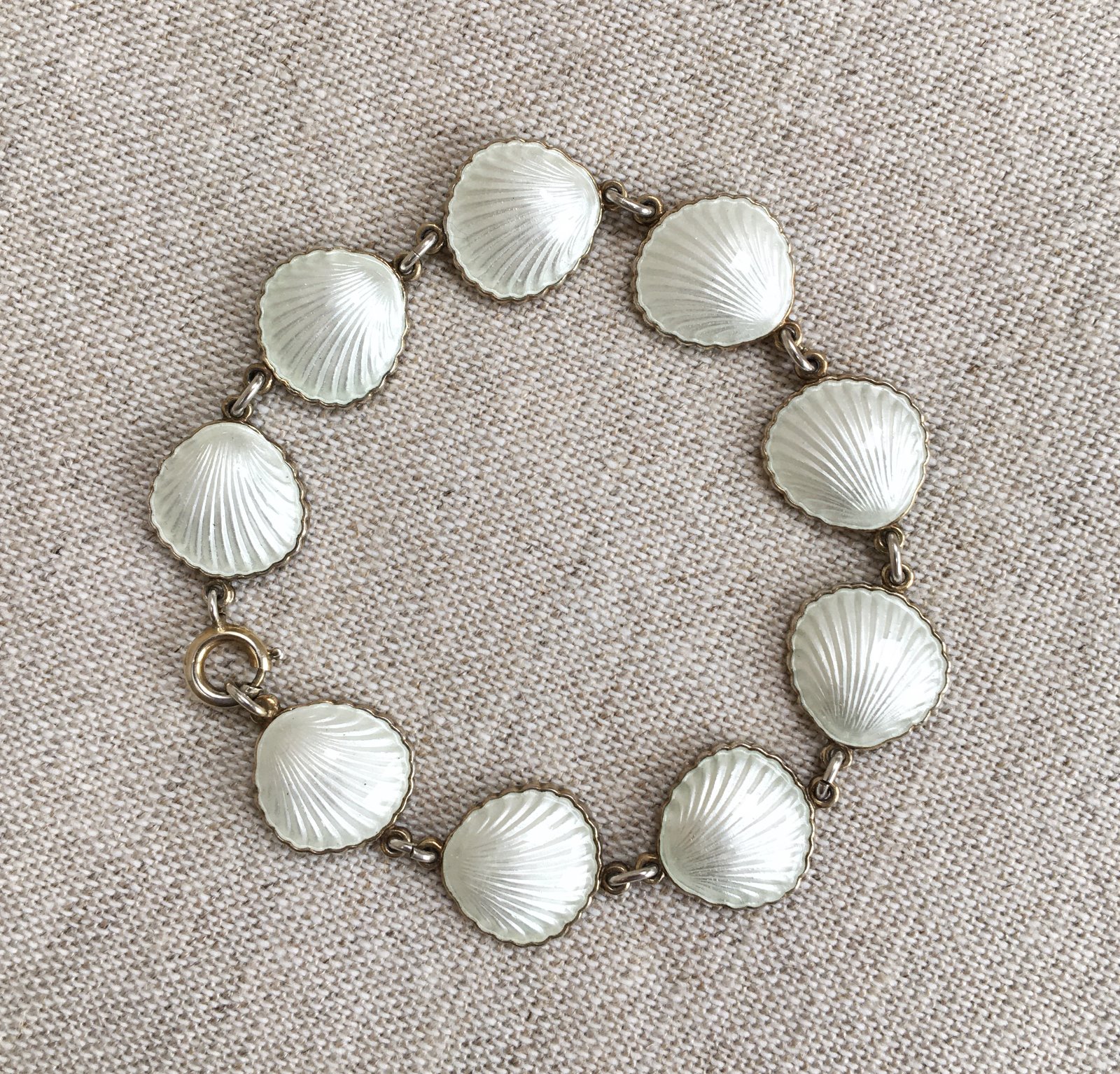Vintage White Guilloche Enamel Shell Sterling Silver Bracelet