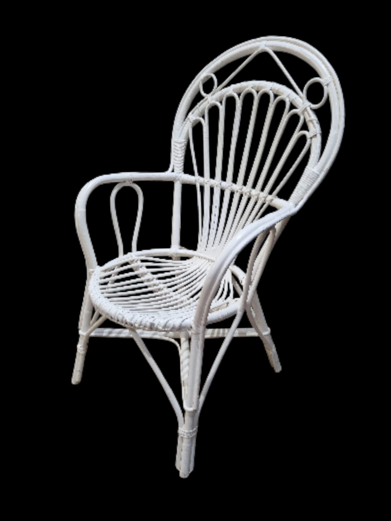 A striking vintage rattan and bamboo armchair featuring an elegant high back with fan-shaped detailing and beautifully curved arms. Finished in white, the chair has a light, airy presence while retaining strong sculptural character typical of mid-century conservatory and garden furniture.