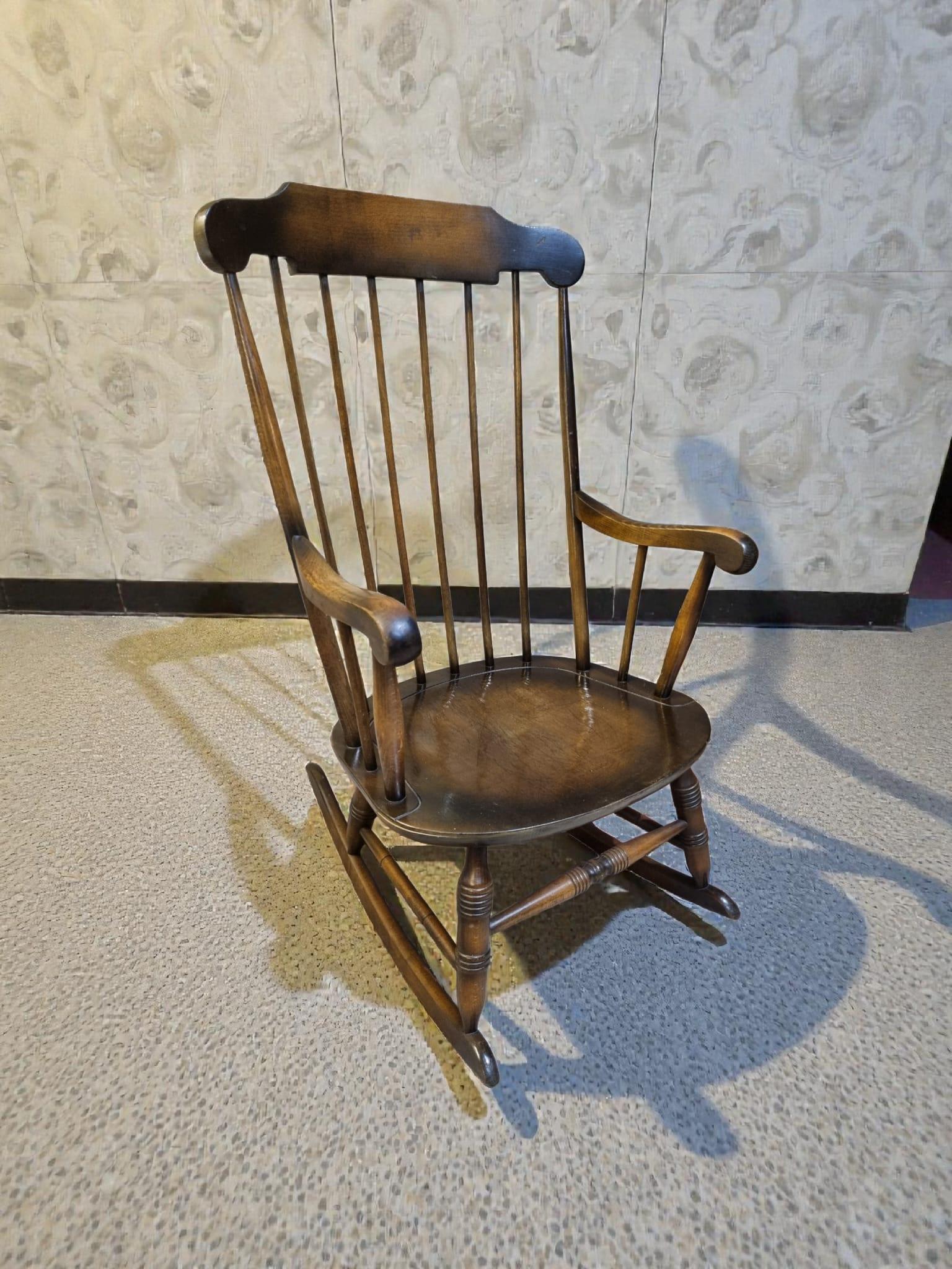 A beautiful vintage wooden rocking chair crafted in the classic Windsor style, featuring a high spindle back and gently curved armrests.