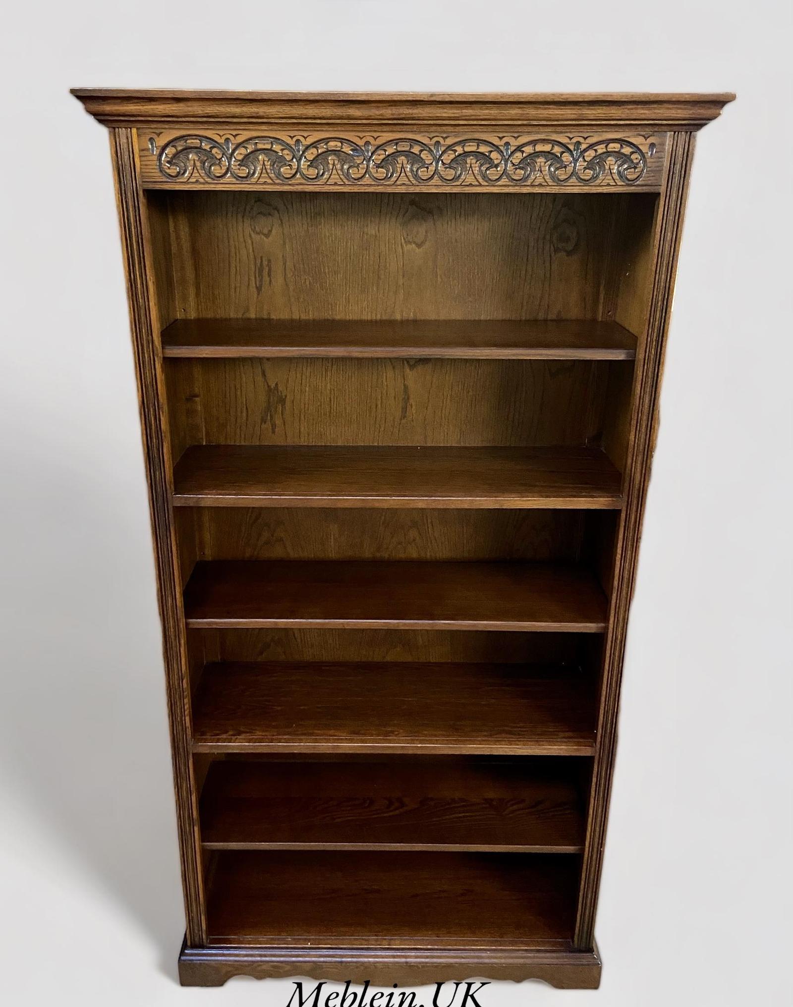 Vintage Wood Brothers Old Charm / Oak Timber Library Tall Bookcases Adjustable Shelves / Made in England / Tudor Brown Oak