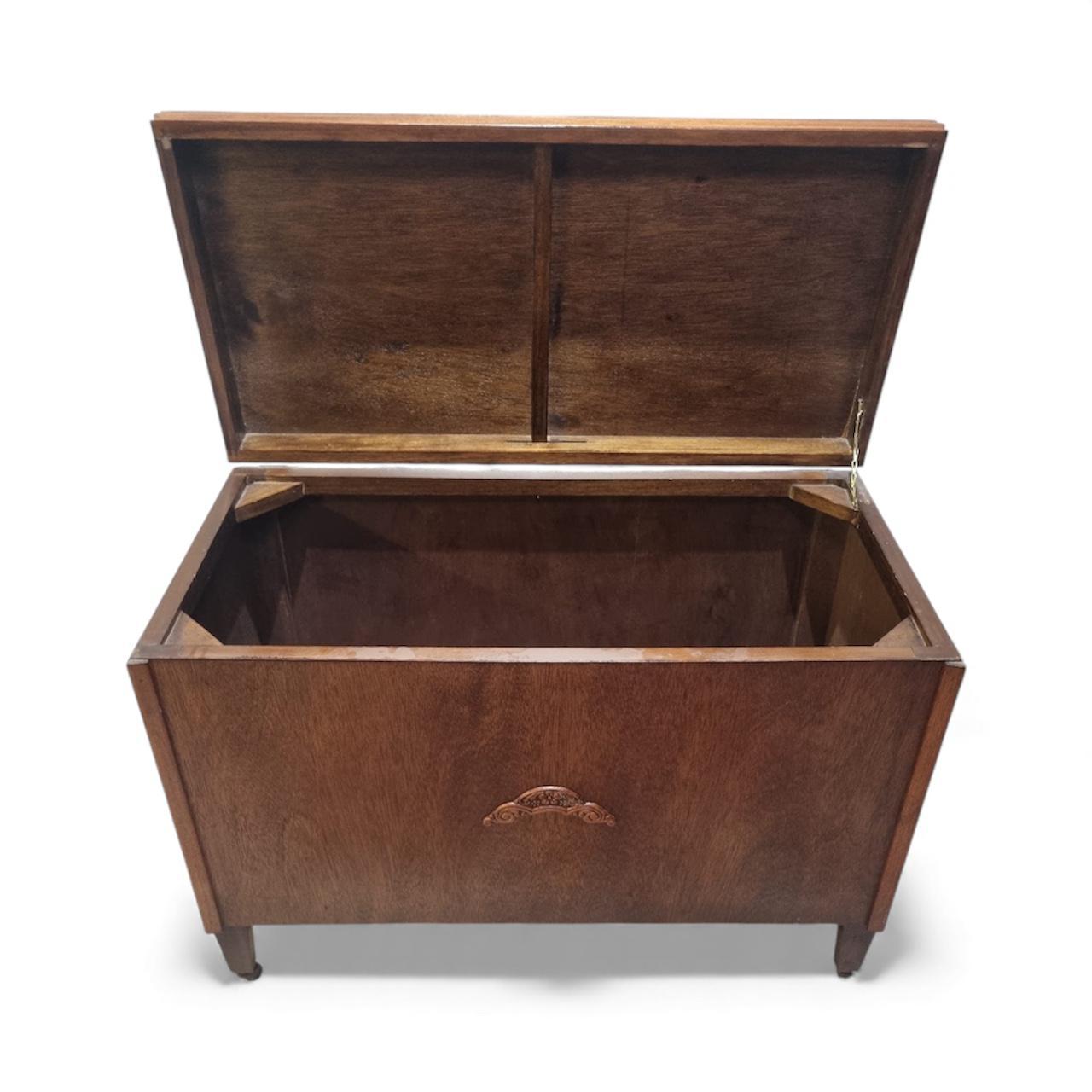 A charming mid-20th-century wooden blanket box in a warm medium-brown finish, featuring a practical lift-up lid and a clean, compartmented interior.