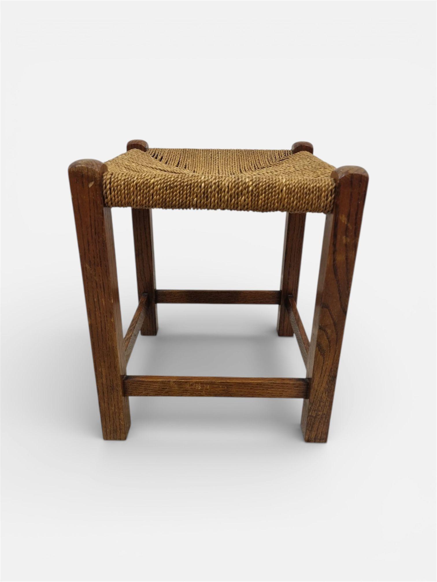 A charming vintage wooden footstool featuring a traditional hand-woven rush seat, presented in good original condition.