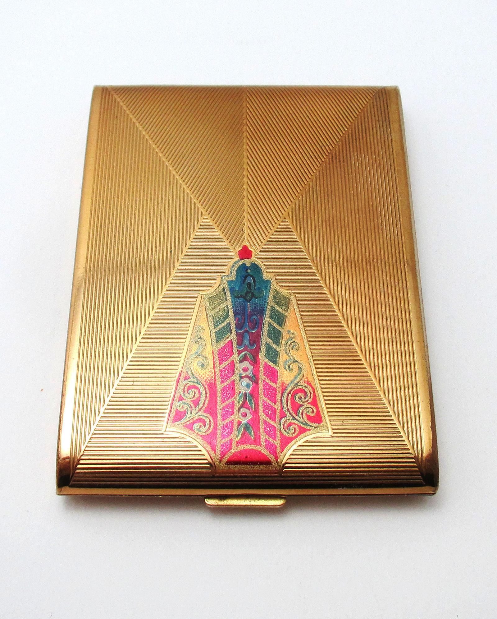 Vintage Zenette Art Deco Gilt Metal Gold Tone Powder Compact Case, Mid Century