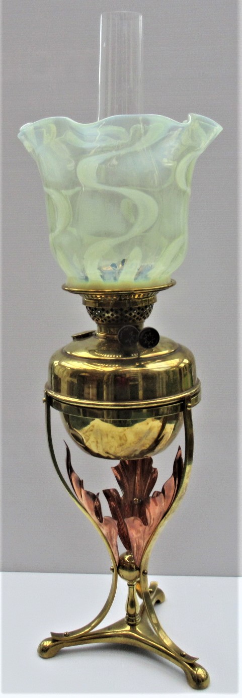 W A S Benson Arts & Crafts Brass & Copper Oil Lamp with Vaseline Glass Shade c.1890