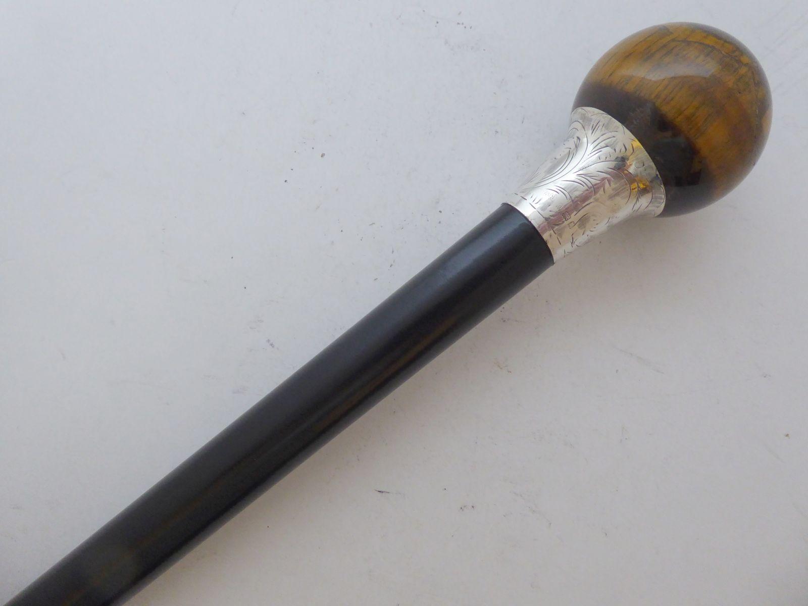 Walking Stick 1926 Hallmarked Silver Collar Ebony Shaft Tigers Eye Top