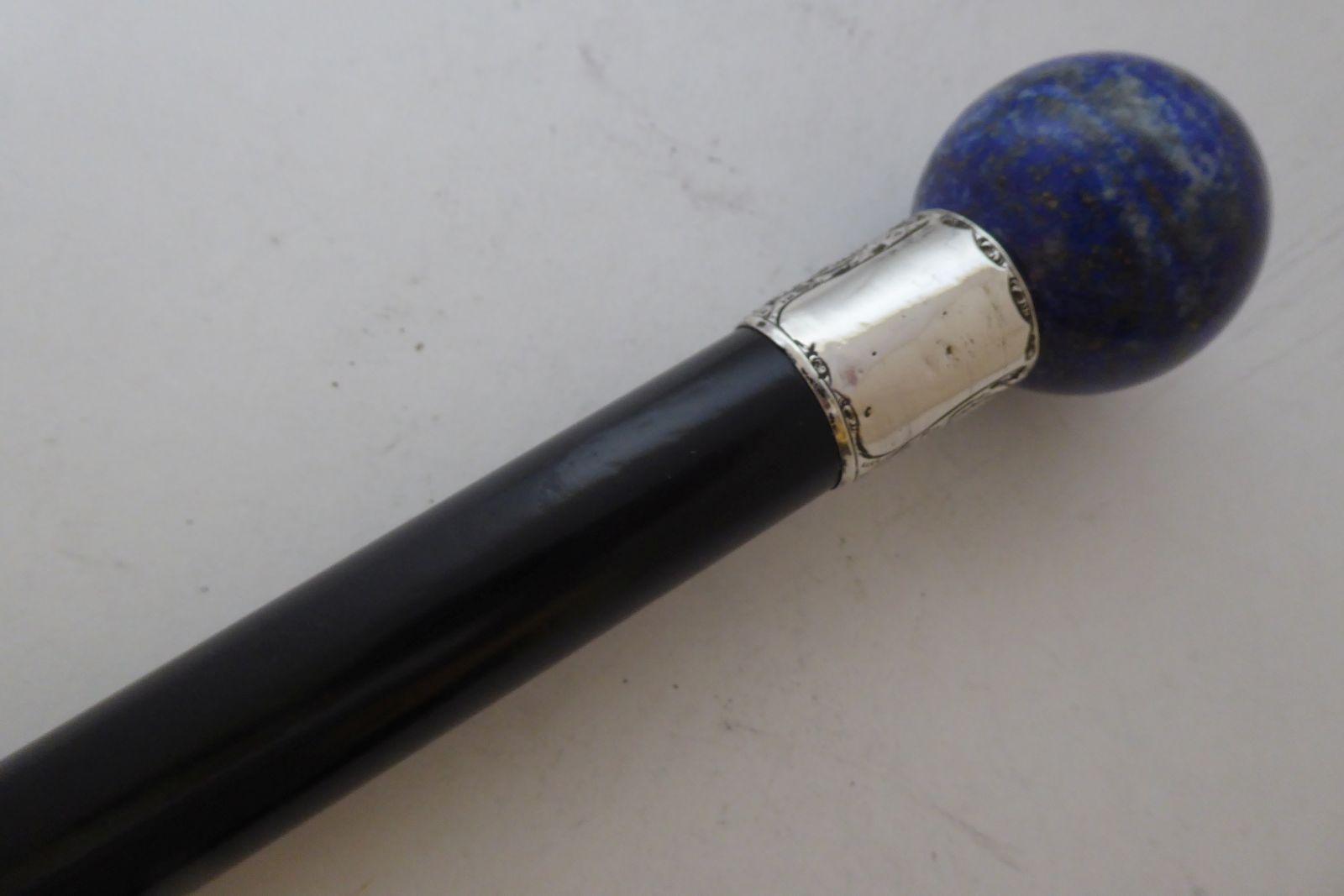 Walking Stick Cane 1892 Hallmarked Silver Collar Ebony Wood Shaft Blue Lapis Lazuli Pommel