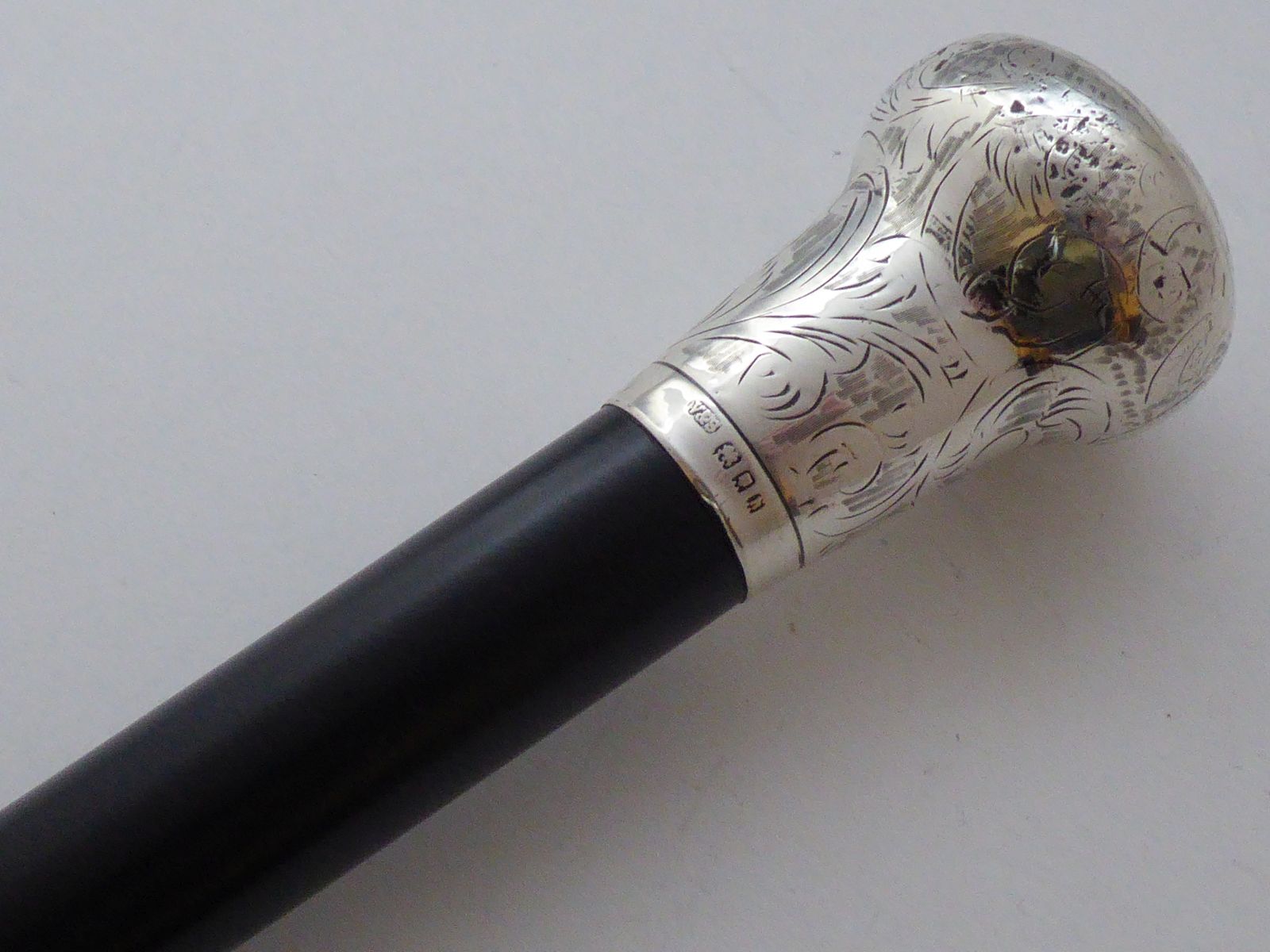 Walking Stick Cane 1903 Hallmarked Solid Silver Pommel Ebony Wood Shaft