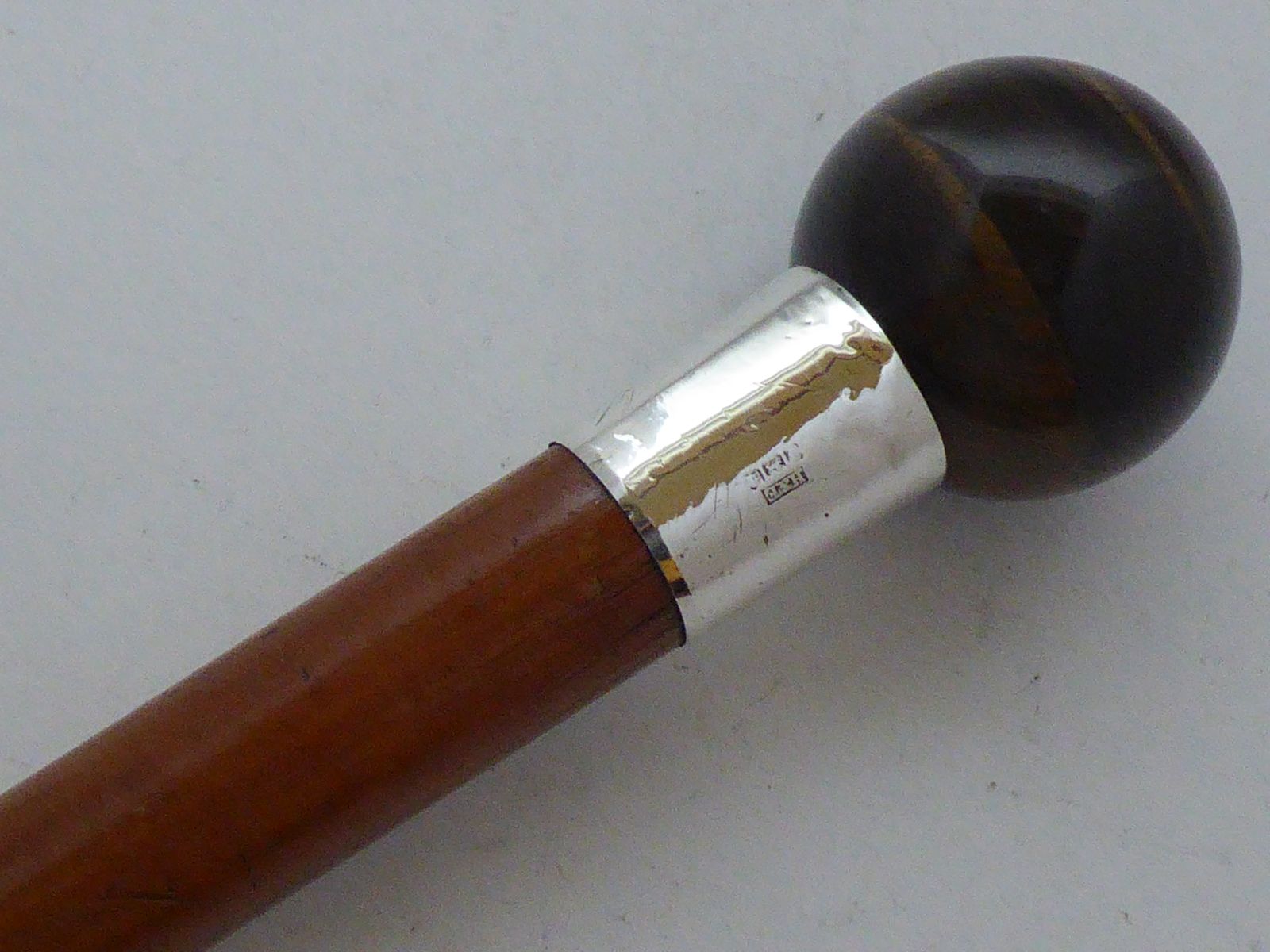 Walking Stick Cane 1904 Solid Silver Collar Malacca Shaft Tigers Eye Pommel