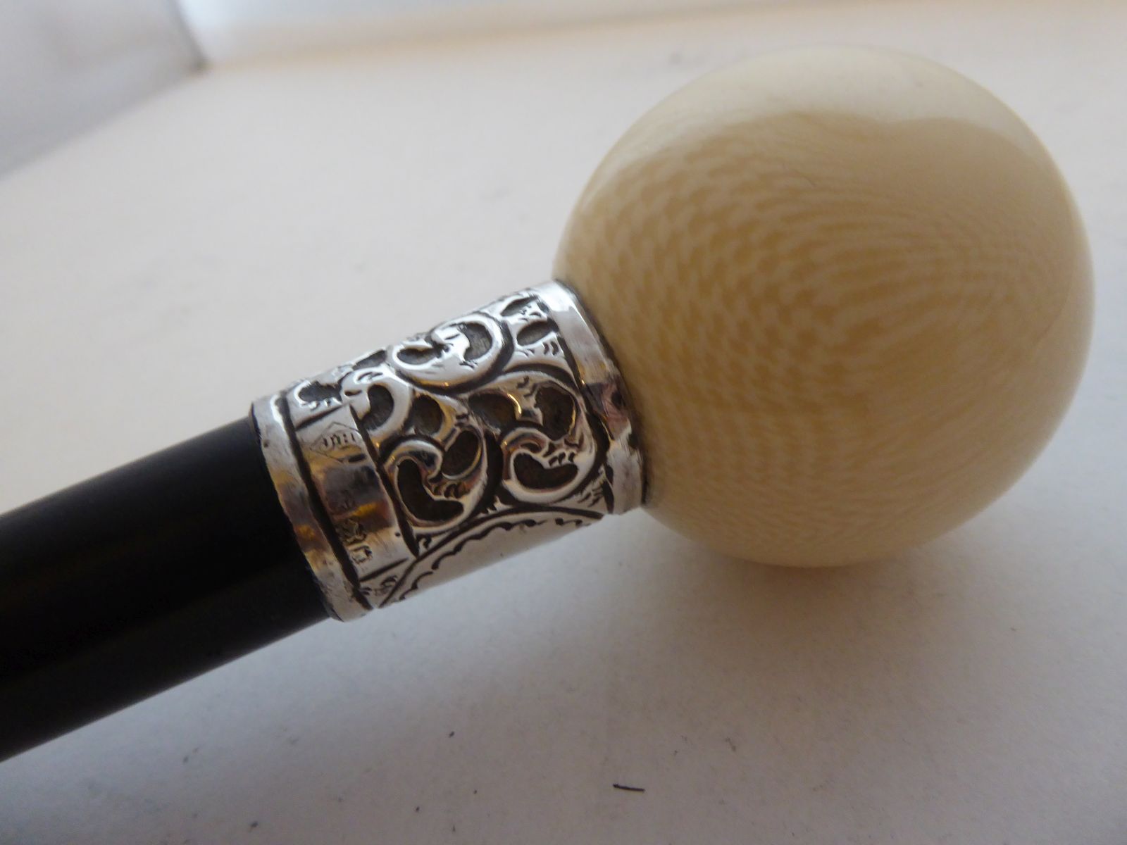 Walking Stick Cane 1905 Hallmarked Silver Collar Tagua Nut Top Ebony Wood Shaft