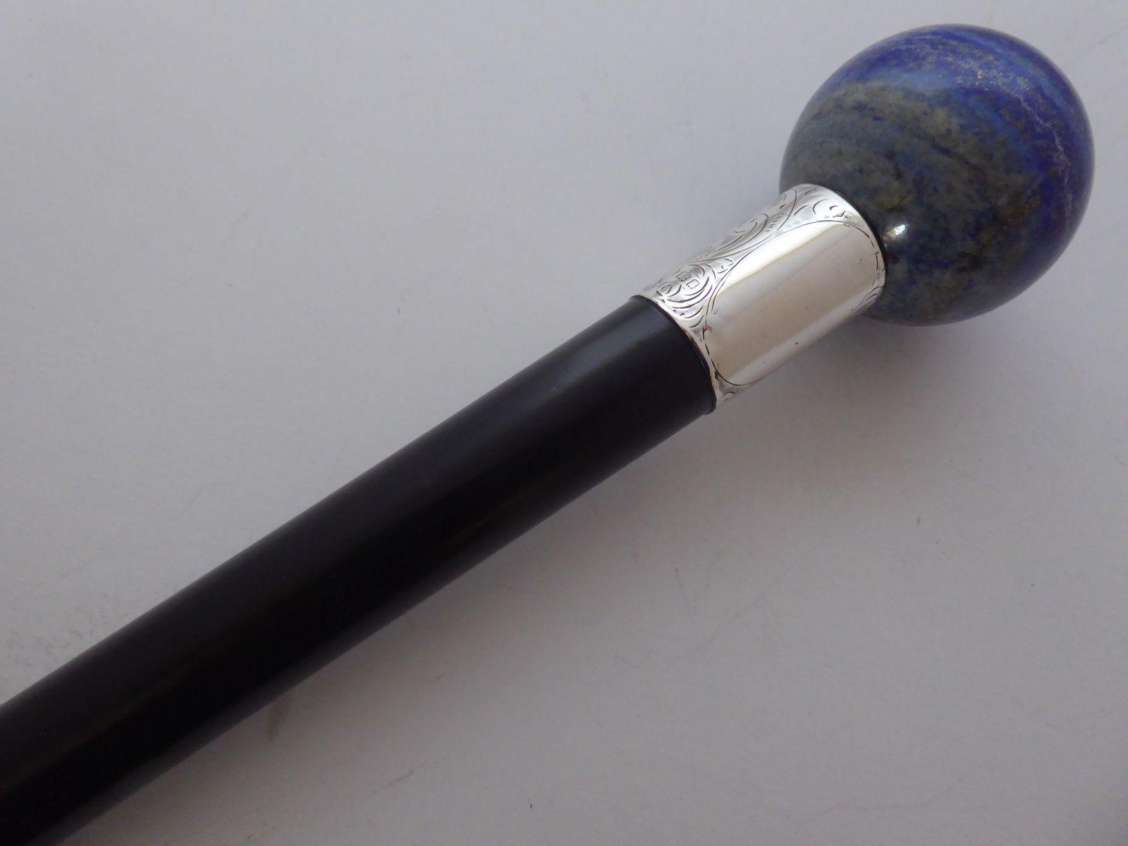 Walking Stick Cane 1906 Hallmarked Silver Collar Ebony Shaft Lapis Lazuli Top