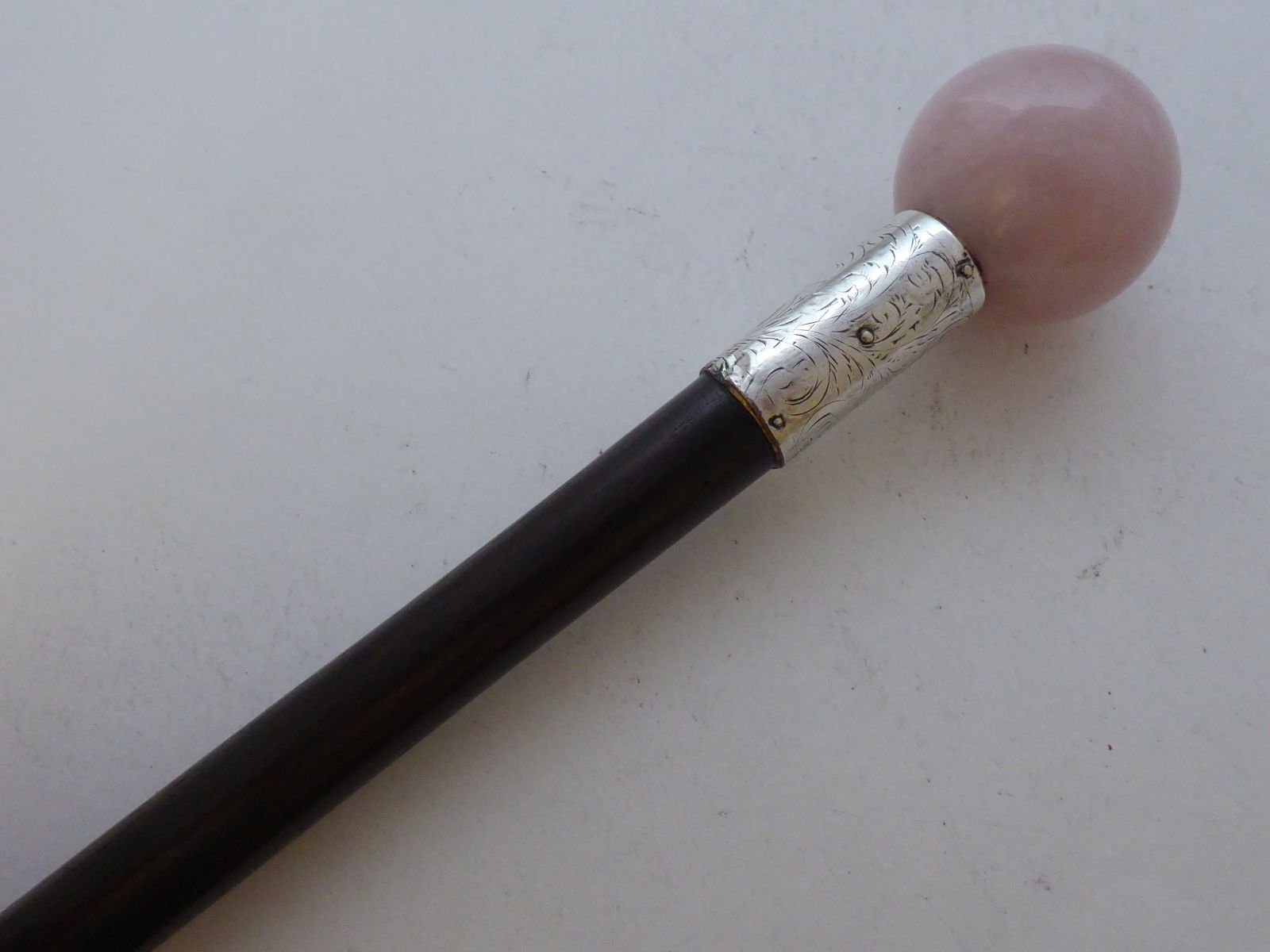 Walking Stick Cane 1906 Hallmarked Silver Collar Rosewood Shaft Rose Quartz Top