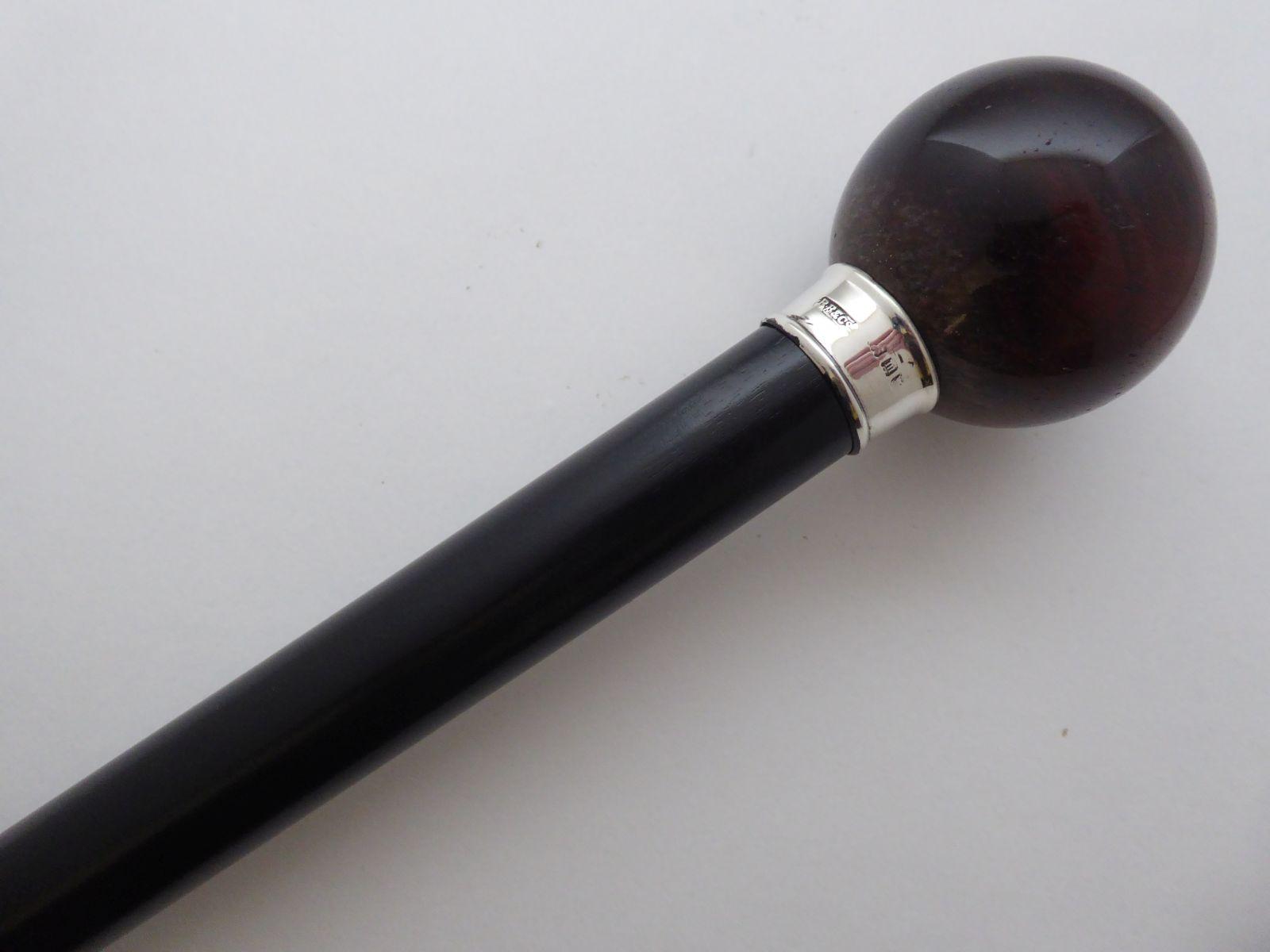 Walking Stick Cane 1907 Hallmarked Silver Collar Ebony Shaft Red Tigers Eye Top